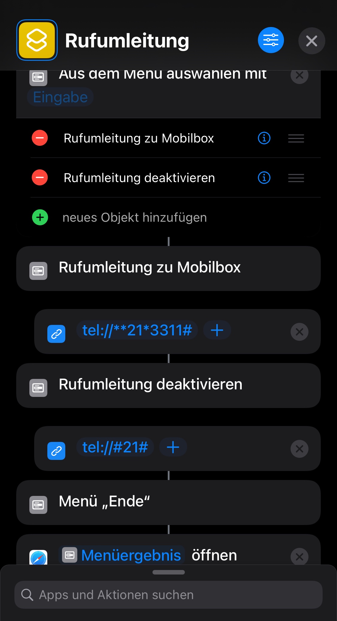 Ich habe einen Kurzbefehl dazu verwendet mit “tel://„ eine Rufumleitung zu setzten bzw. zu deaktivieren: