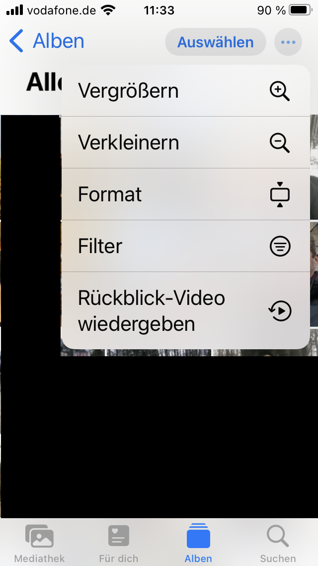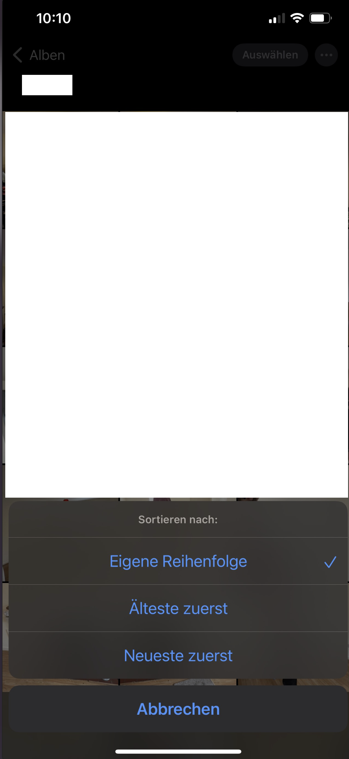 Wenn du in einem Album auf die 3 Punkte tipps, dann öffnet sich ein Menü und dort wählst du dann Sortieren aus. Woher stammen die Fotos in dem Album welche du sortieren möchtest? Wurden die Fotos mit deinem iPhone gemacht und das Album mit dem iPhone erstellt oder wurde das Album mithilfe von einem Computer auf dein iPhone synchronisiert?