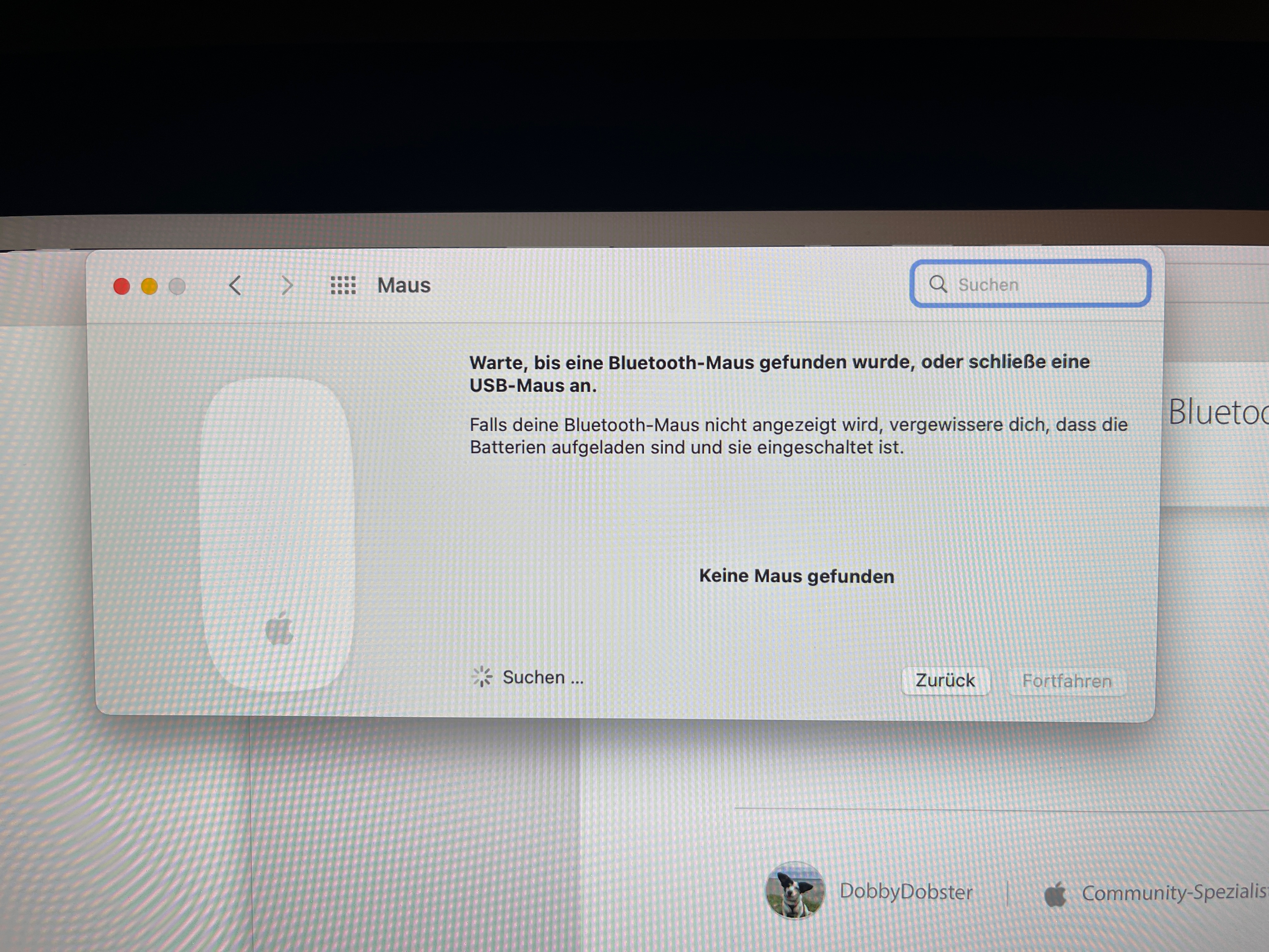 Wenn ich in Systemeinstellungen - Maus - Bluetooth Maus konfigurieren gehe, kommt u.a. Fenster und findet keine Maus. Lg