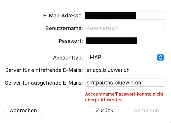 Der Port steht auf 993, die Mailadressen waren korrekt, aber weder liess sich ein IMAP noch ein POP Konto einrichten.