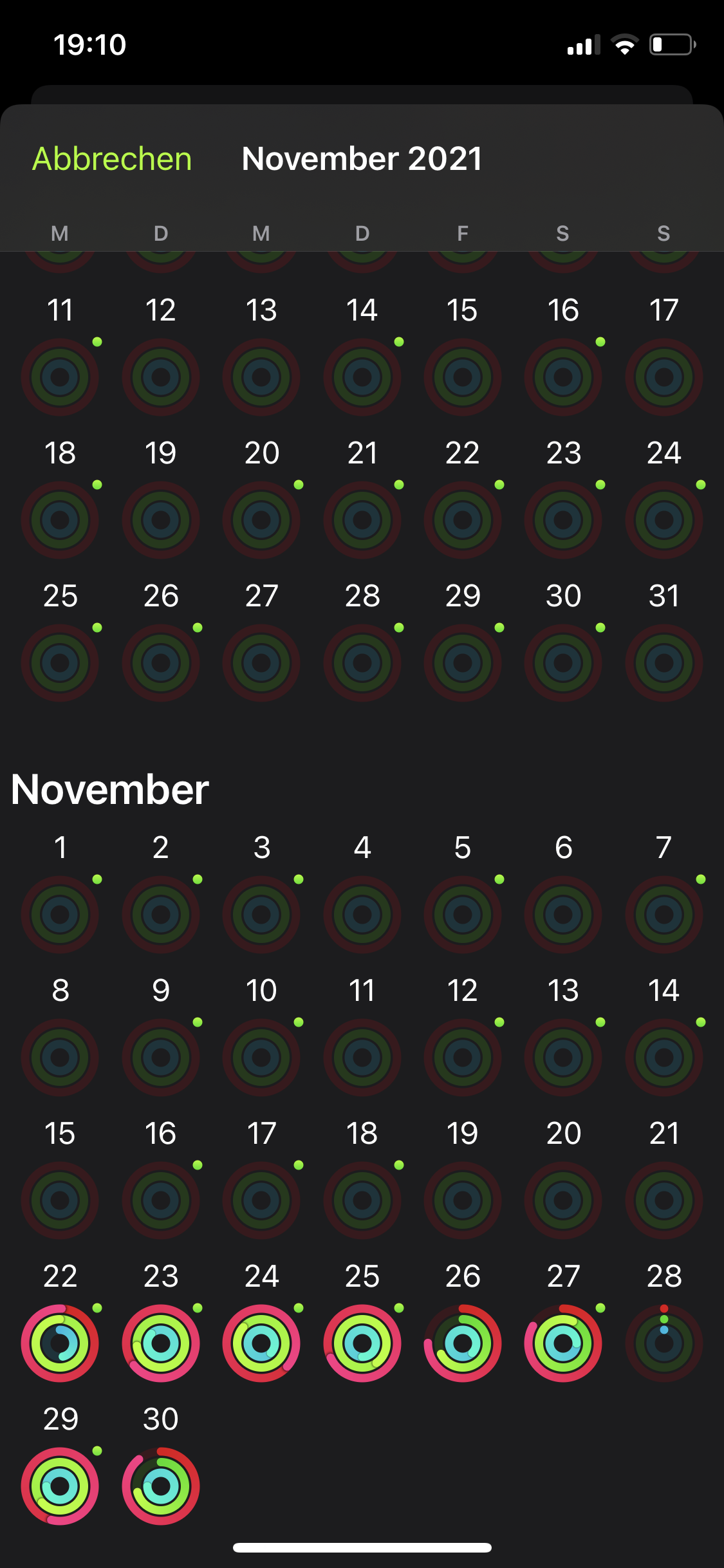 Ein kleiner grüner Punkt weißt lediglich darauf hin, das an diesem Tag ein Training abgeschlossen wurde. Dieses wird mir auch angezeigt wenn ich die einzelnen Tage aufrufe. Jedoch sind die Ringe der betroffenen Monate lehr.