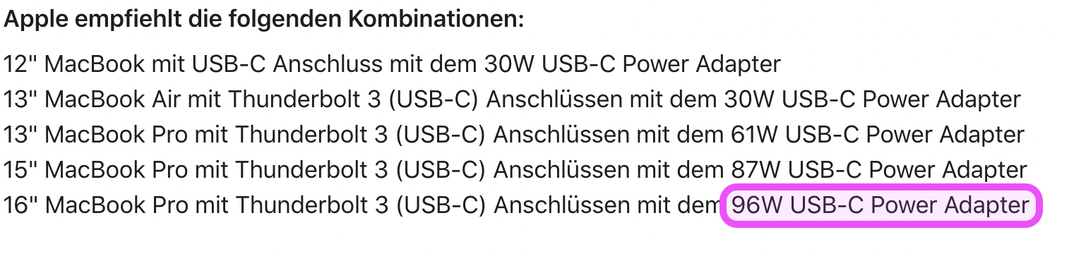 Müsste ich zur Verwendung eines USB-C Ladekabels daher auf z.B. ein Apple 96 W Netzteil ausweichen?