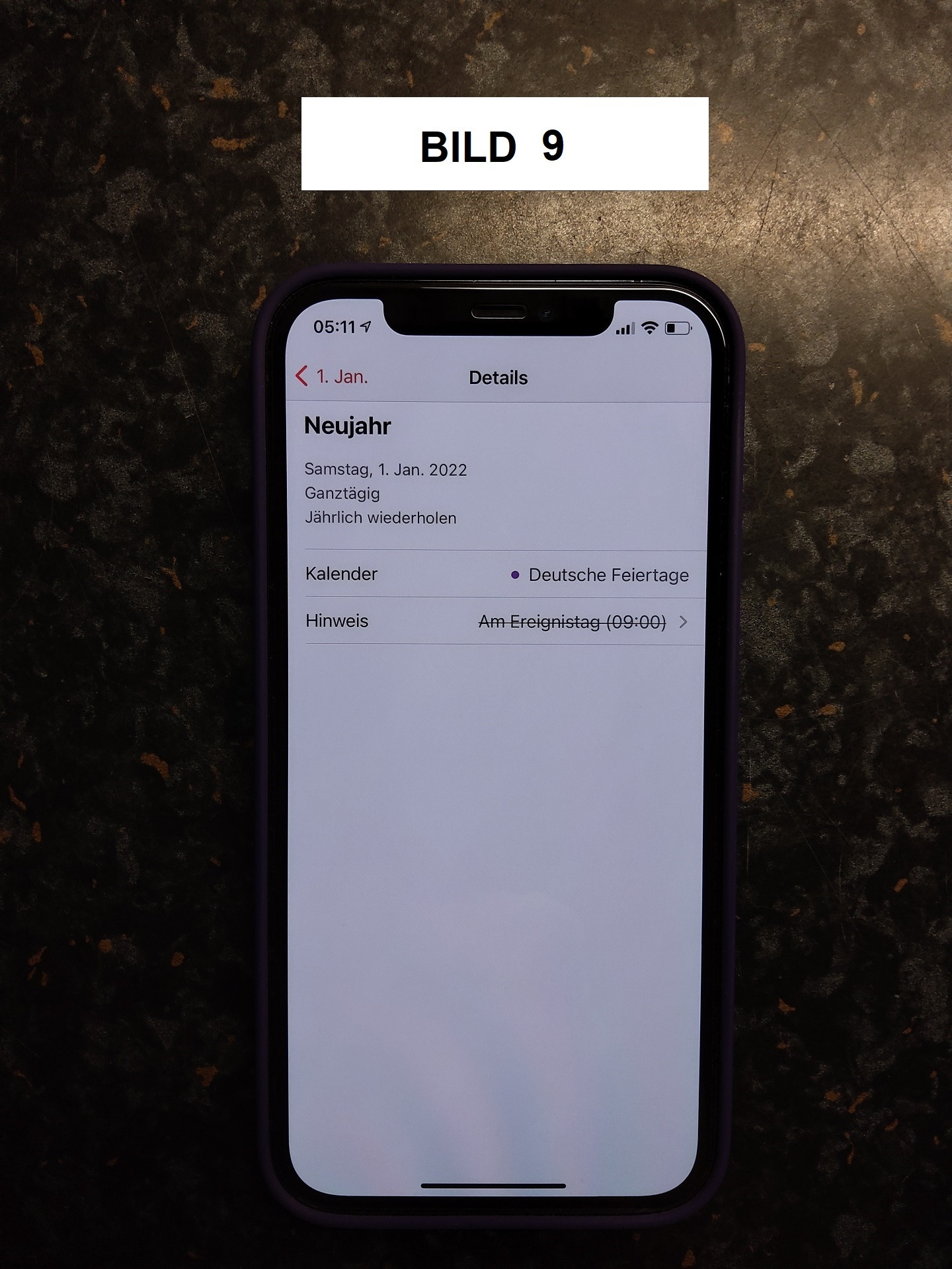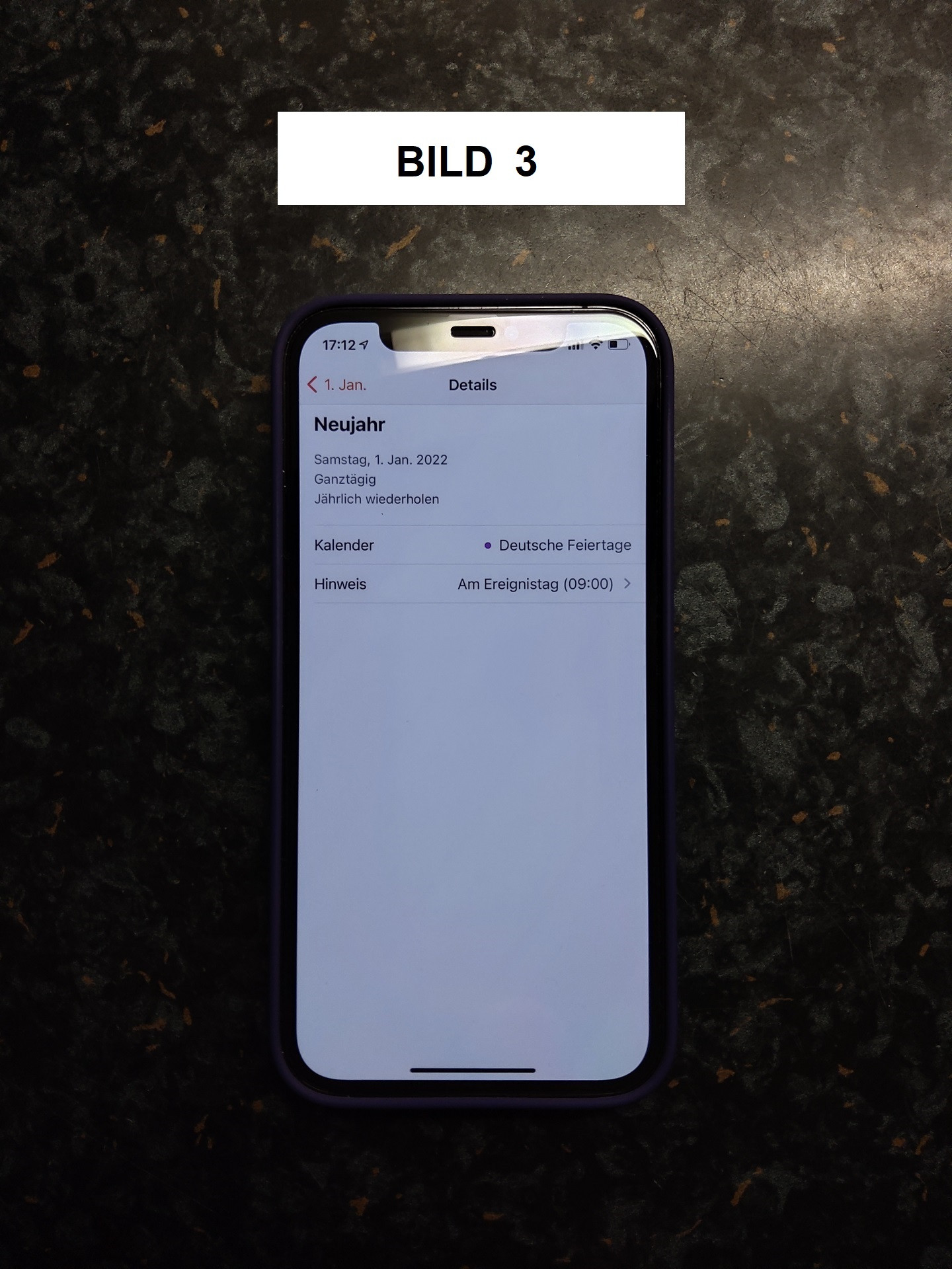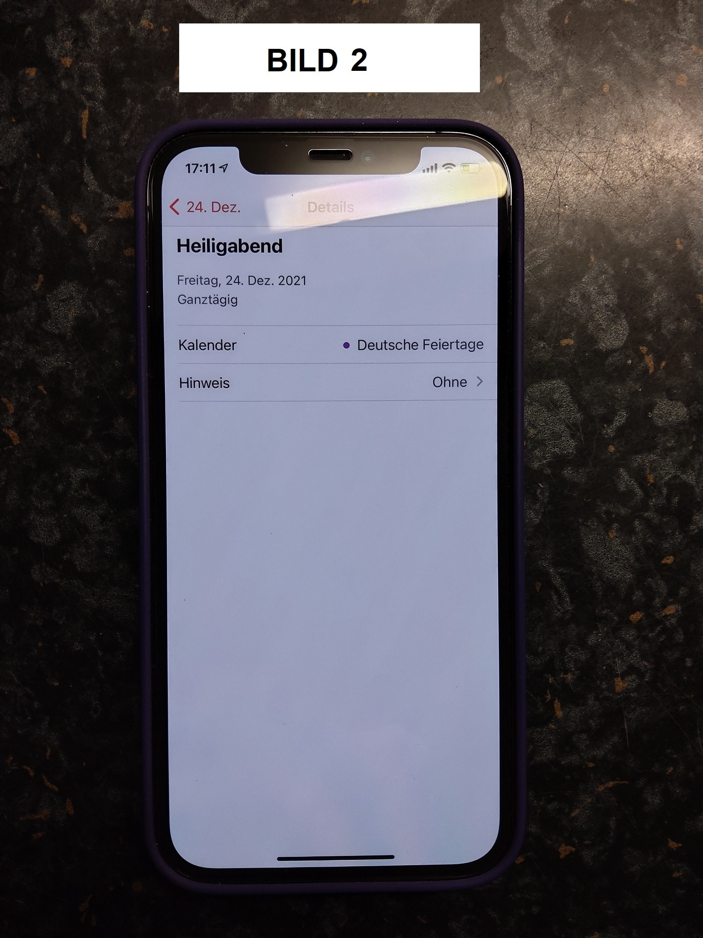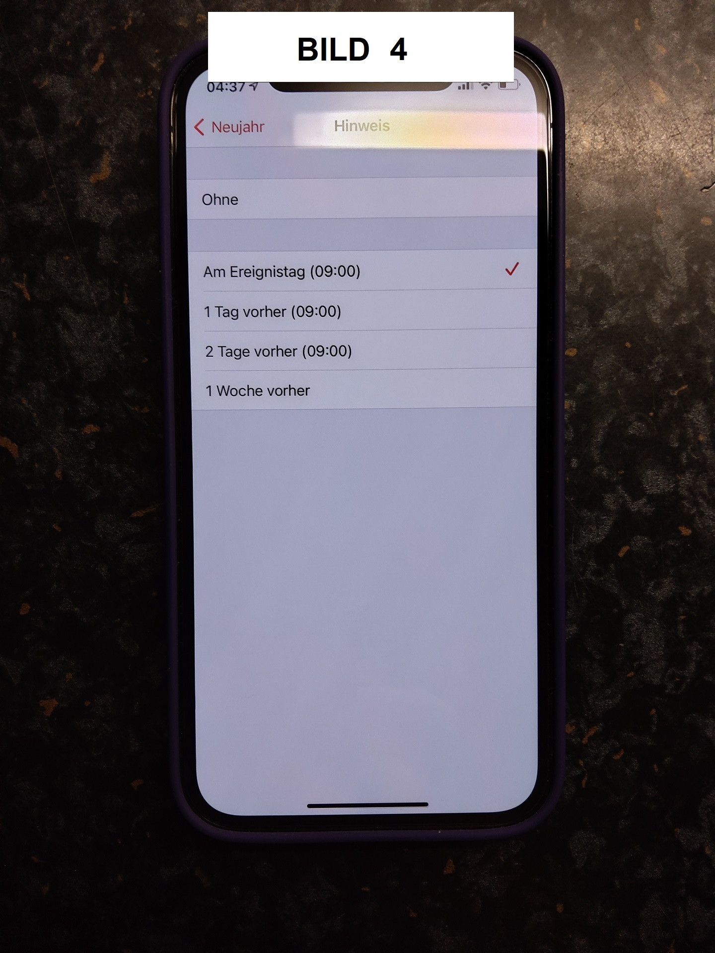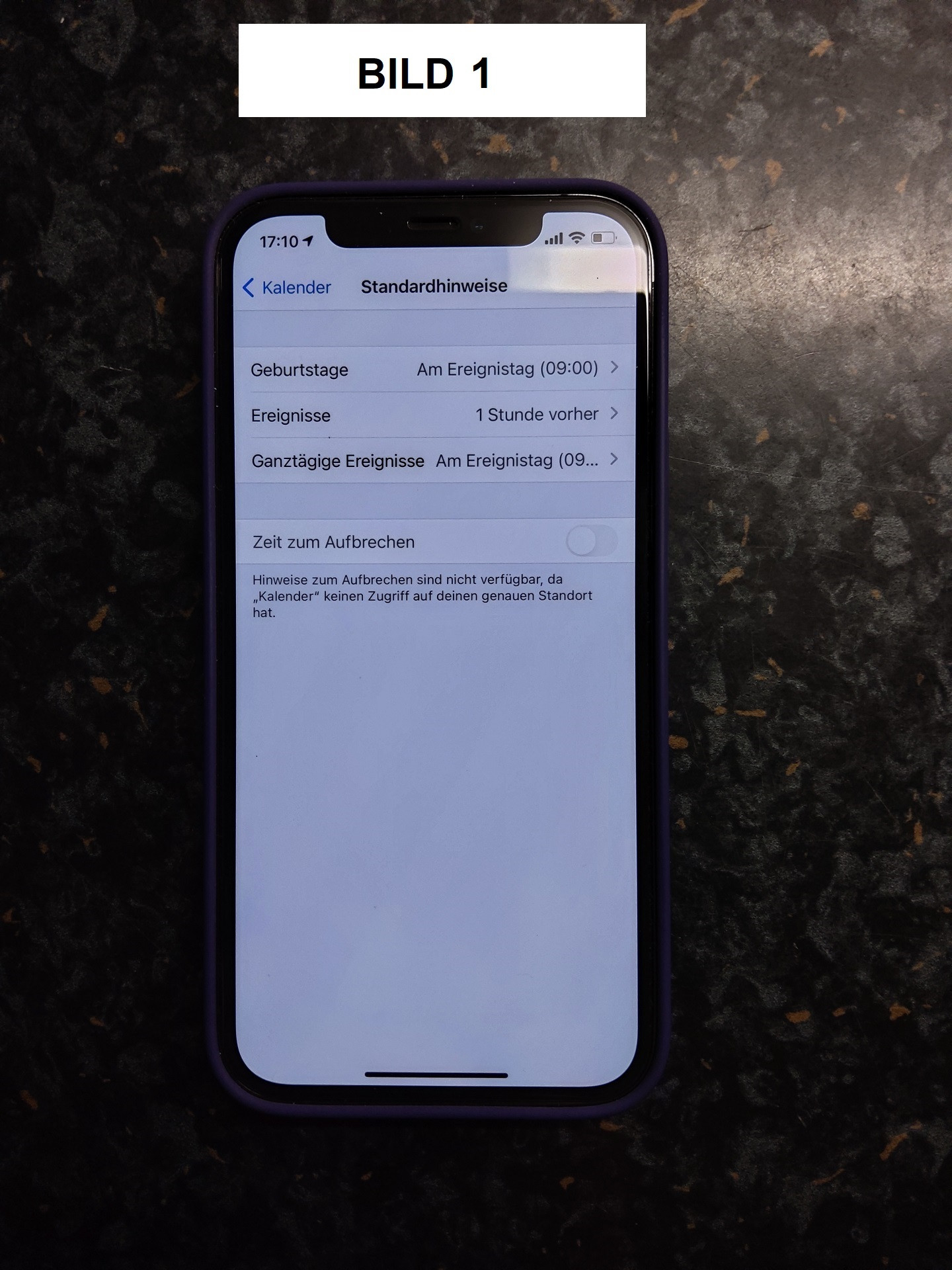 Bild 1 = so sehen unter Einstellungen > Kalender > Standardhinweise unsere Einstellungen aus
