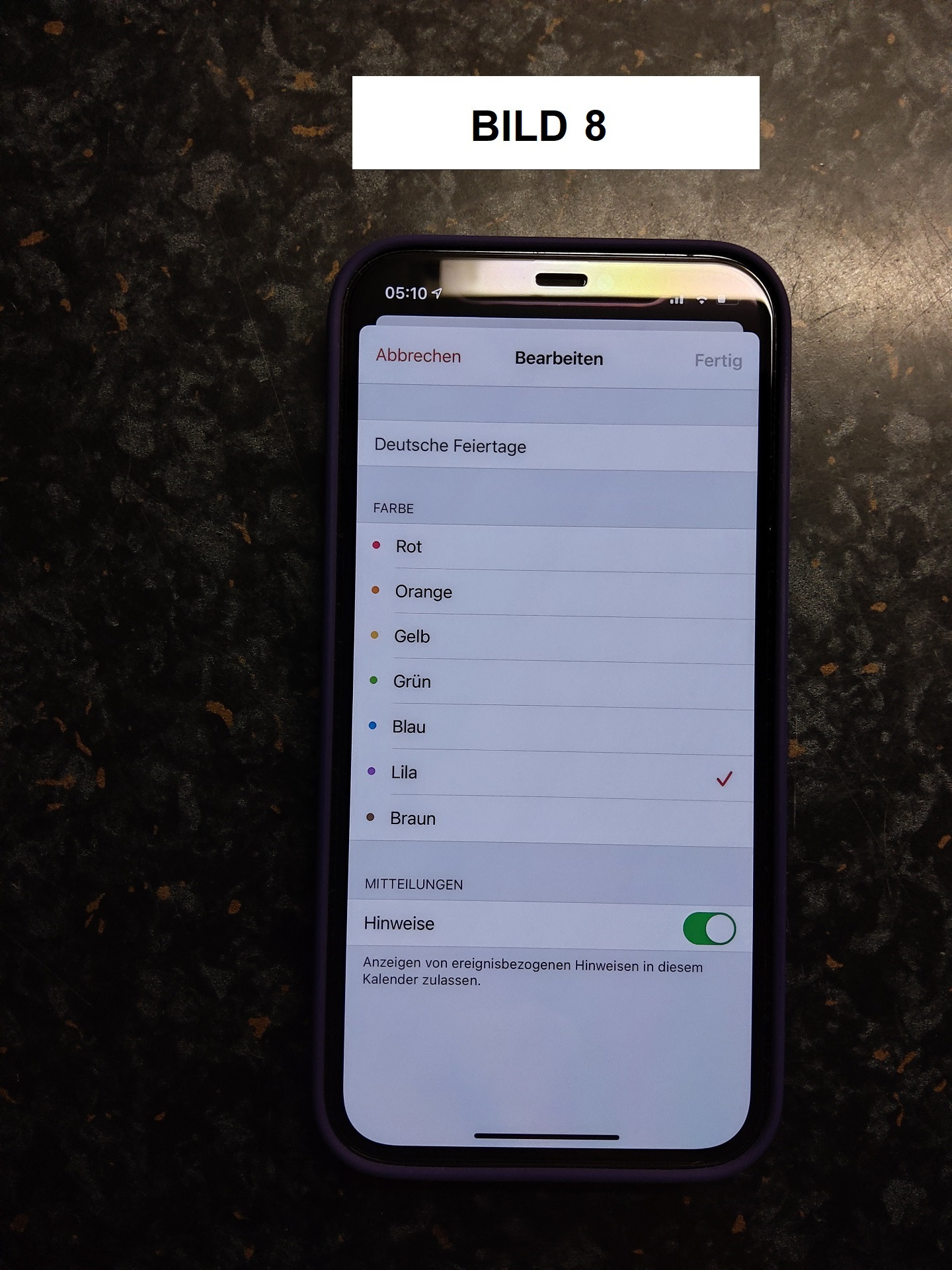 Bild 8 = in der Kalender-App unten auf Kalender klicken. Dann hinter dem abonnierten Kalender auf das eingekreiste i. Jetzt kann ich die Hinweise kompeltt ausschalten.