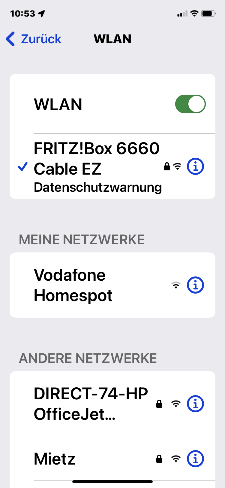 um die Datenschutzwarnung wegzubekommen, kannst Du die private WLan-Adresse aktivieren. Dann verschwindet dieser Hinweis, und das iPhone meldet sich jeweils mit einer neuen MAC-Adresse beim Router an. Wenn Du aber eine Fritzbox verwendest, ist es sehr wahrscheinlich, daß Dir die Fritzbox den Zugang zum Netz verweigert. Denn diese Boxen akzeptieren häufig nur bekannte Geräte. Und ein iPhone,das sich immer mit einer neuen unbekannten MAC am Netzwerk anmeldet, ist grundsätzlich mal neu und unbekannt.