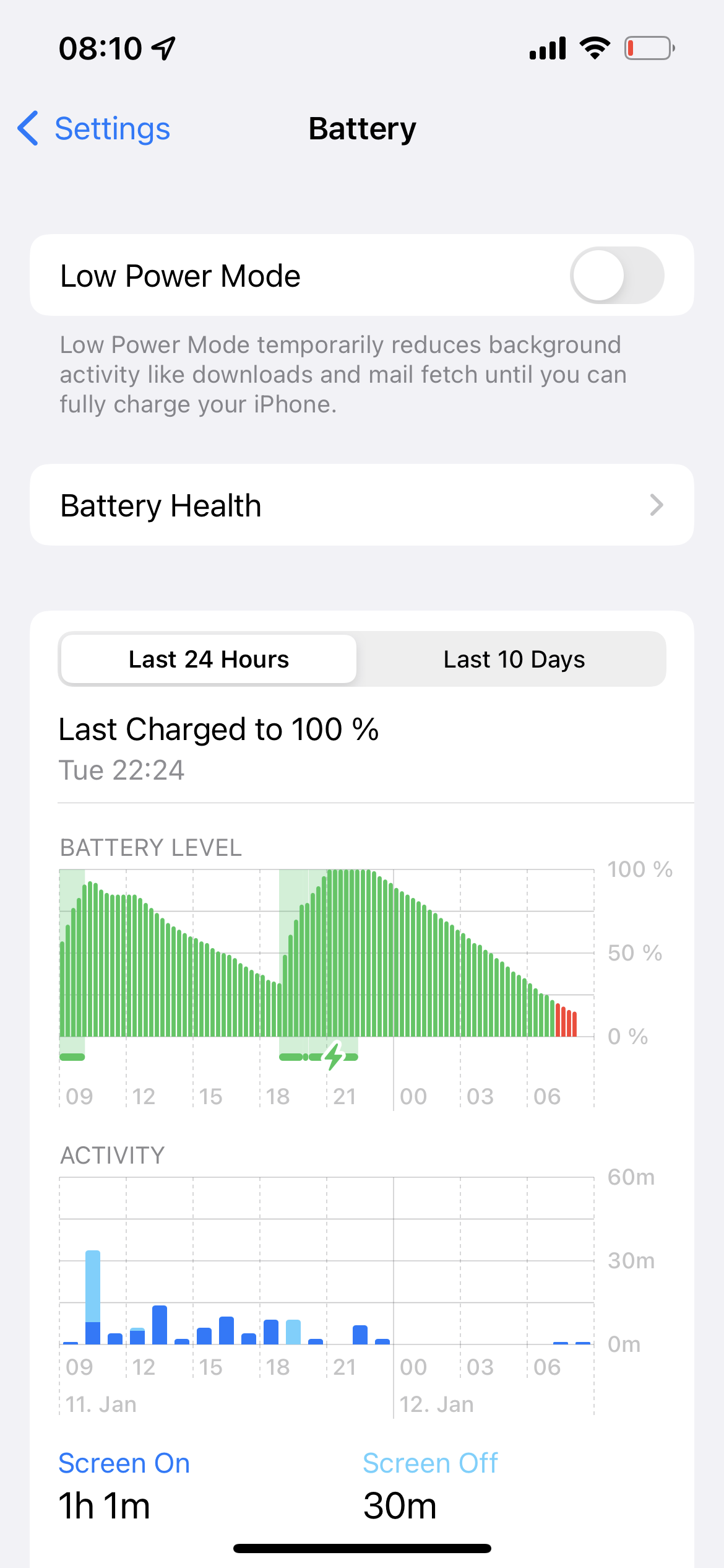 Wie man unschwer erkennen kann habe ich das iPhone13 Pro (iOS 15.1.1) Abends voll geladen und dann im Grunde nicht mehr benutzt. Nach 9 Stunden ist der Akku bei 10%! Dinge wie Background App refresh, Location tracking etc. ist alles aus. Ich habe in den letzten Tagen schon gemerkt das der Akku sich schneller als gewöhnlich entleert, war mir aber nicht sicher. Jetzt bin ich es. Hat irgendjemand anders das Problem?