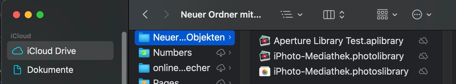 Seit macOS Big Sur schützt das System uns bei iCloud Drive vor solchen Fehlern. Wenn ich eine Foto-Mediathek auf iCloud Drive verschiebe, erscheint direkt neben der Mediathek eine durchgestrichene Wolke. iCloud Drive synchronisiert diese Mediathek nicht mit iCloud, um sie zu schützen.