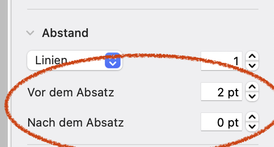 Für den Abstand zwischen den Absätzen sind dort die beiden Optionen "Vor dem Absatz" bzw. "Nach dem Absatz" entscheidend, dort gibst Du rechts in die Felder ein, wie groß der Abstand (zusätzlich zum Zeilenabstand) sein soll. Das Feld darüber (rechts neben "Linien") definiert den Zeilenabstand innerhalb eines Absatzes.