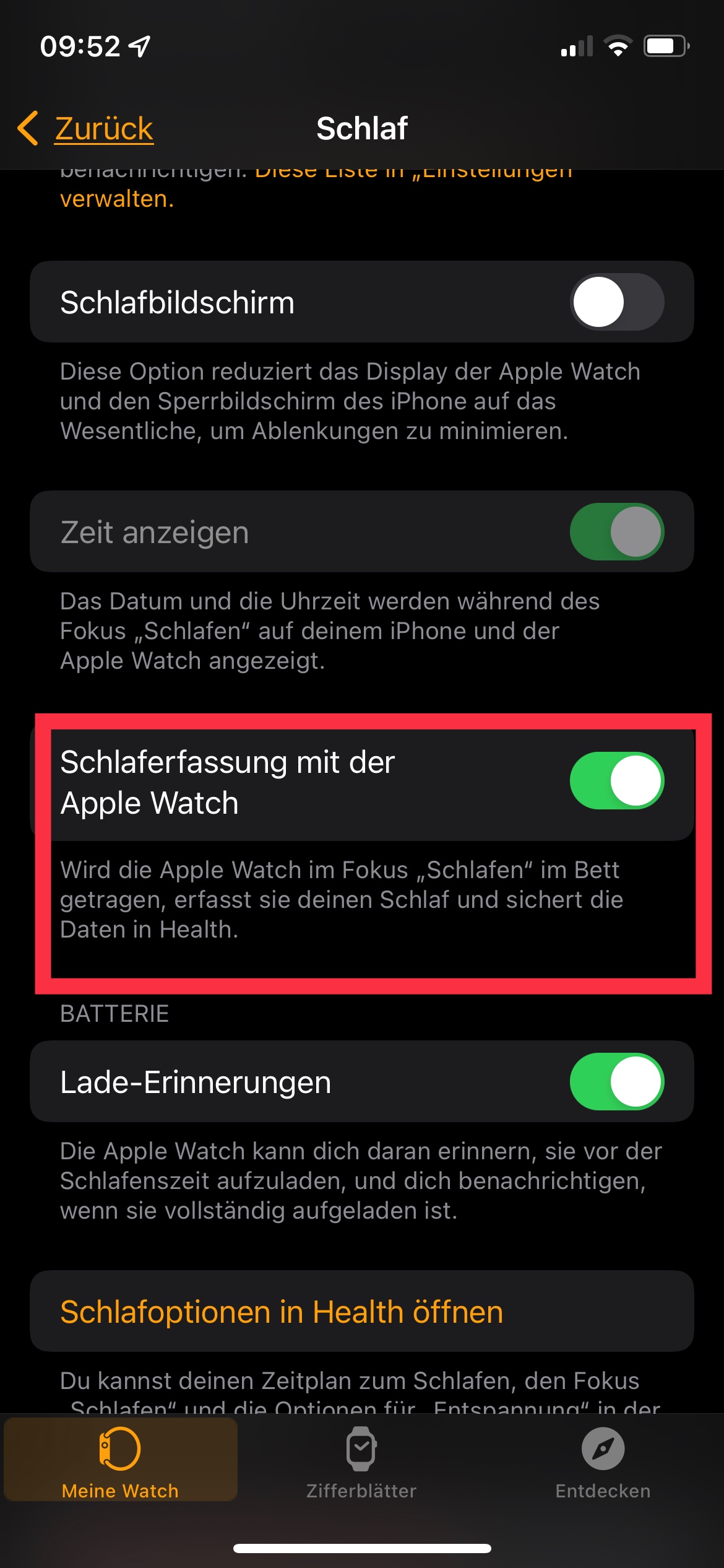 Wichtig ist auch, dass in der Watch App deines iPhones unter der App „Schlaf“ die Option „Schlaferfassung mit der