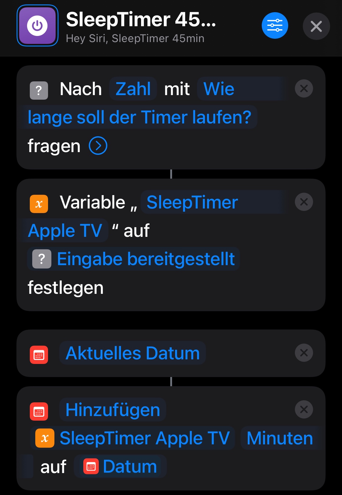 Ich würde gerne mit der App „Kurzbefehle“ eine Automation erstellen, in der ich die Zeit für den Sleep Timer einstellen kann, nach Ablauf des Timers soll dann mein Apple TV in den Ruhezustand/ aus gehen. Ich möchte dies gerne lösen, ohne zum Beispiel in einen „nicht Stören“-Modus zu gehen, denn die Erreichbarkeit soll weiterhin vorhanden bleiben.