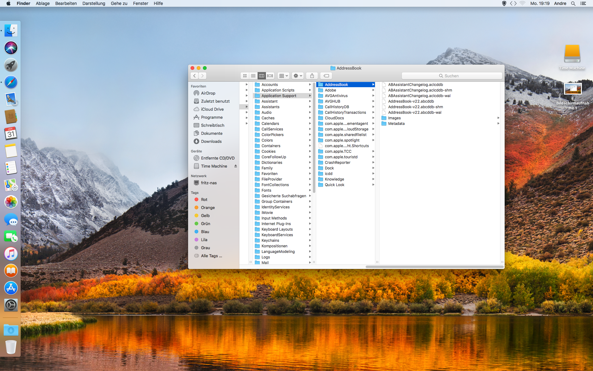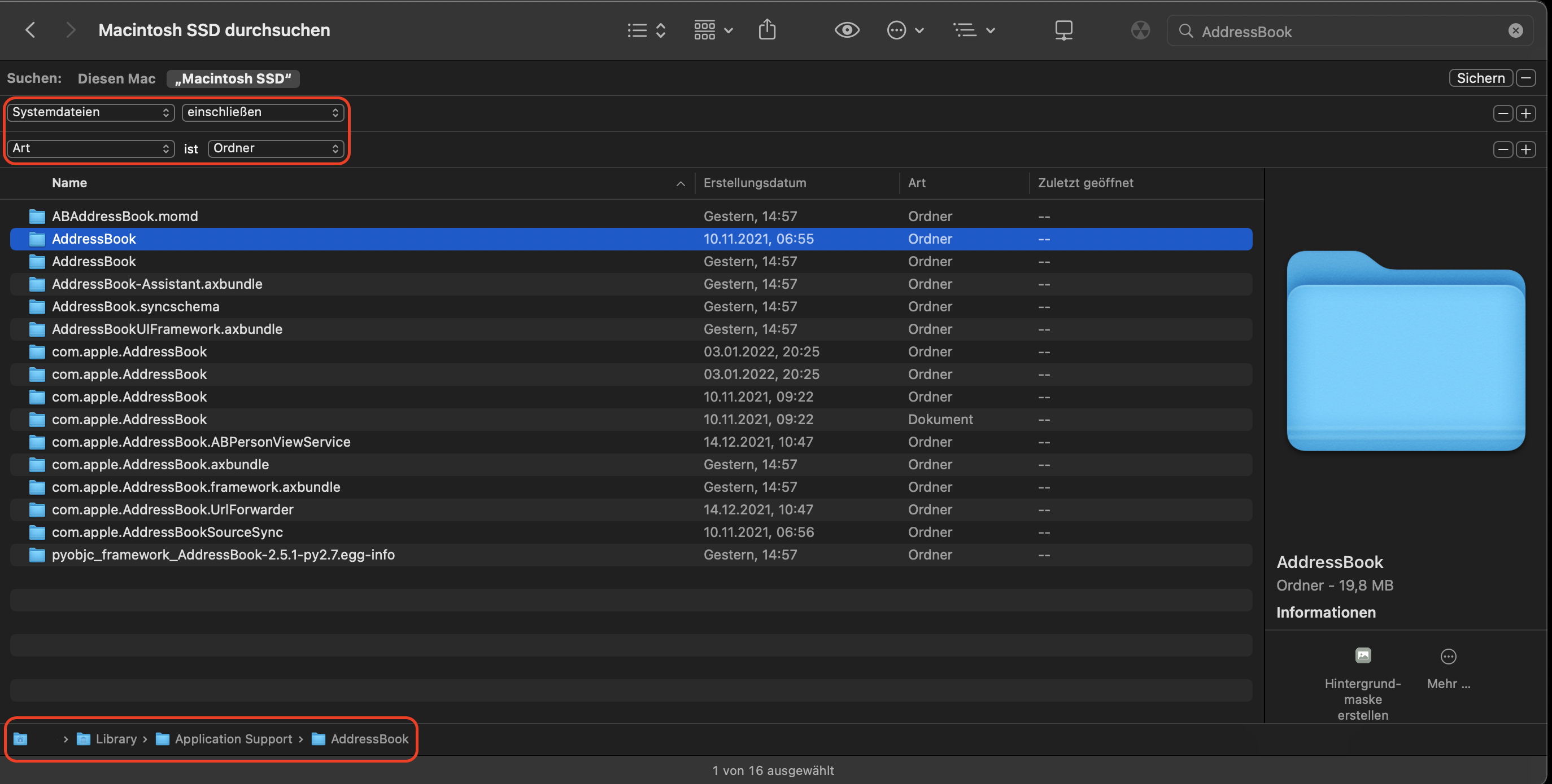 ok, erledigt. Und das AddressBook ist im Ordner unter Appl.Support mit den angezeigten Ordnern. Hoffentlich ist der screenshot sichtbar. Mit der Suchfunktion konnte ich den Ordner AddressBook nicht finden - komisch, oder?