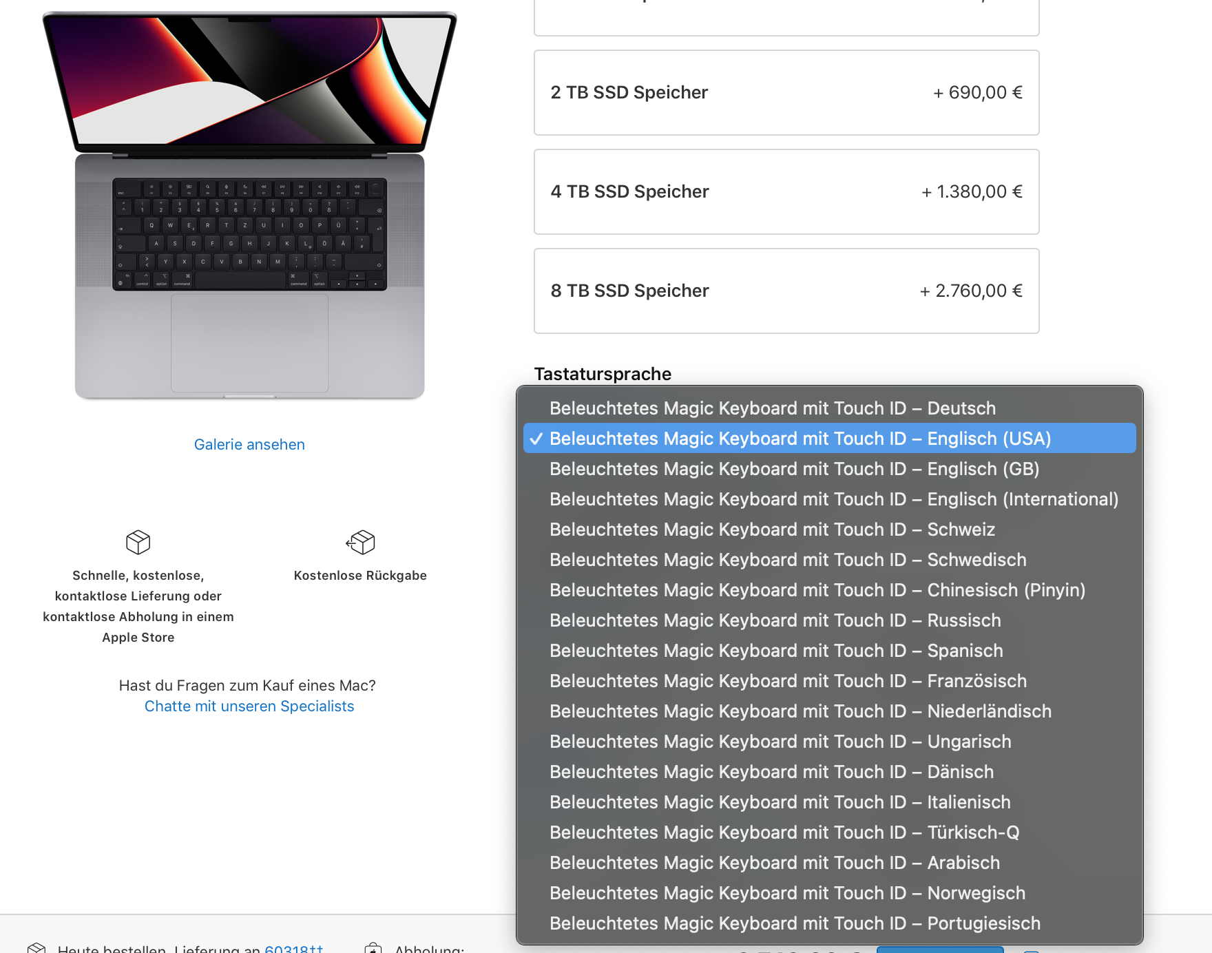 Ich brauch ein MacBook Pro 16 GB RAM, 512 GB SSD, 14-Core GPU mit Englisch Tastatur. Ist das Verfügbar?