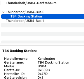 Rufe mal die Systeminformation auf. Findest du unter "Programme -> Dienstprogramme". Dort dann nachsehen ob deine Dockingstation oder Hub unter "Thunderbolt/USB4" angezeigt wird. Bei mir schaut es wie im beigefügtem Screenshot aus.