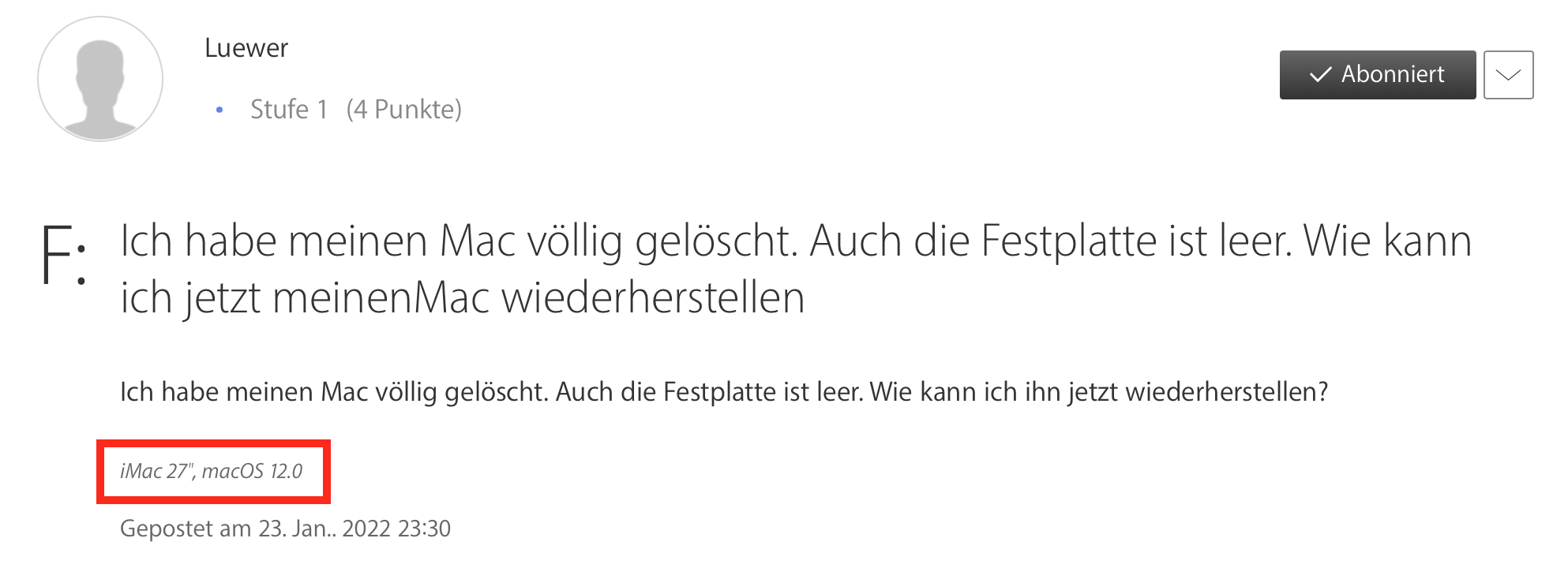 Ich habe meinen Mac völlig gelöscht. Auch die Festplatte ist leer. Wie kann ich jetzt meinenMac wiederherstellen
