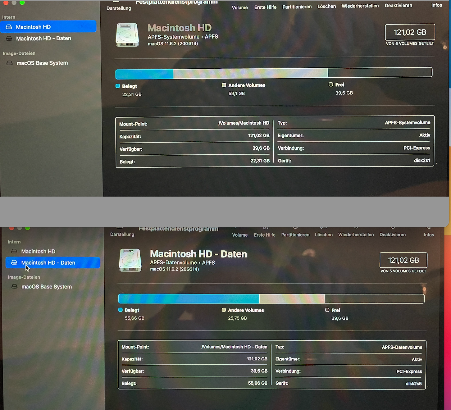 Dann erscheint über Macintosh HD das Hauptlaufwerk, nennt sich vermutlich AppleSSD oder ähnlich. Das wird gelöscht.