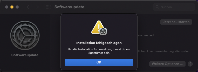 Nun wollte ich das Update Monterey 12.1 installieren und erhalte folgende Fehlermeldung.