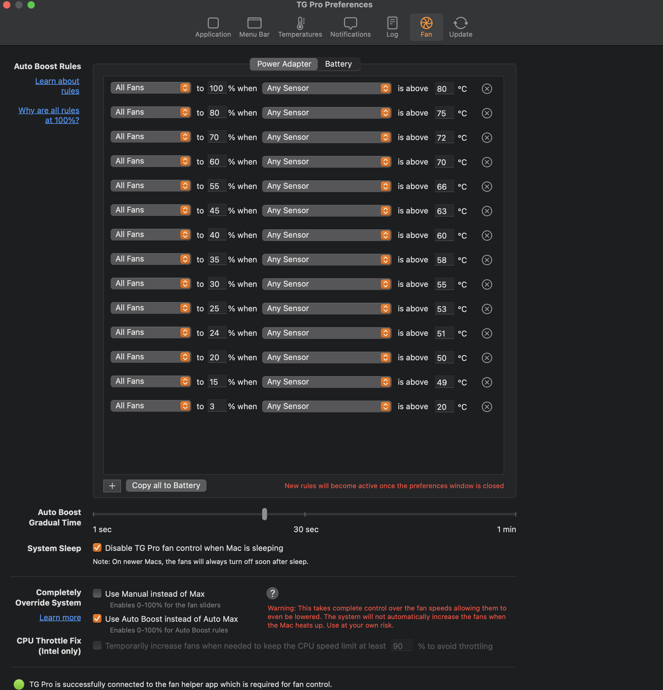 Zwar wird dann die Systemsteuerung für die Temp.-steuerung außer Kraft gesetzt (komplett), aber das ist ist deshalb nicht so entscheidend, dass mir das MBP nun abraucht. D.h., die AutoBoost Option sichert dann bei erreichen der max. eingestellten Temperatur 100% Lüfterdrehzahl.