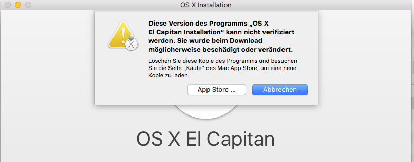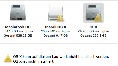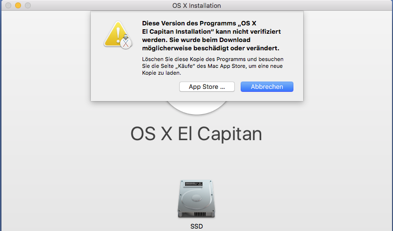 Beim Versuch El Capitan auf SSD zu installieren, mit dem Installer per Terminal dorthin portiert, kam folgende Meldung: