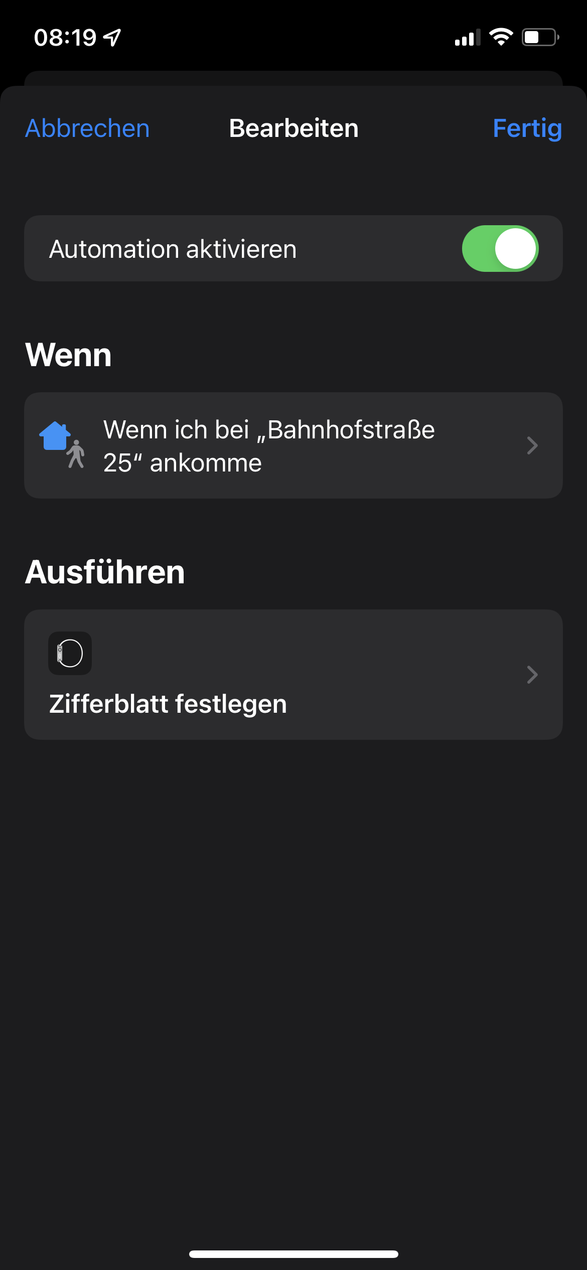 ich hoffe, es kann mir jemand einen Tipp geben. Meine neue Watch ist mit meinem iPhone verbunden. Auf dem iPhone habe ich schon eine Automation erstellt, mit der zu einer bestimmten Uhrzeit das Display der Watch nicht mehr beim Anheben aktiviert wird. Diese funktioniert. Eine weitere funktioniert allerdings nicht: Wenn ich mit beiden Geräten an einem bestimmten Ort ankomme, soll das Zifferblatt geändert werden. Hat jemand einen Tipp, woran es liegen kann?