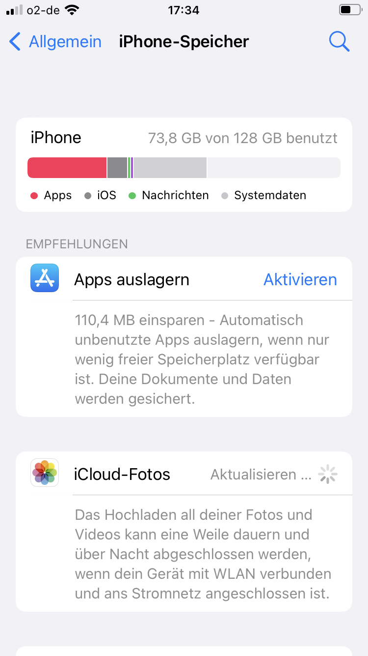 Beim lokalen Speicher ist vor allem wichtig, wieviel Speicher du mit Daten belegt hast, für die du ein Backup brauchst., Deine Bildschirmfotos zeigen, dass du auf dem iPhone 73GB mit Daten belegt hast.