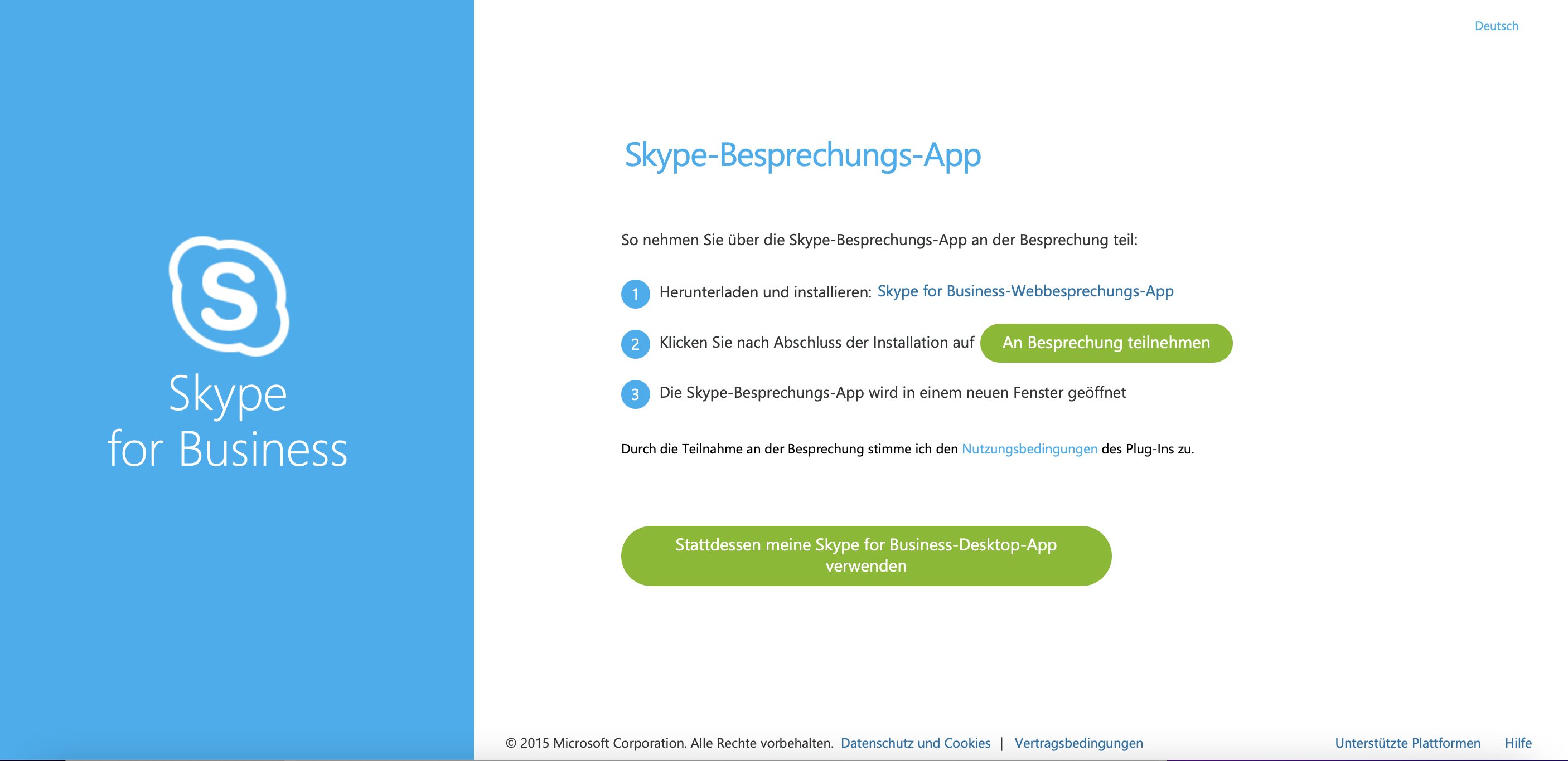 2) Ich gelange auf die Skype for Business-Seite und gehe dort auf "Besprechung teilnehmen" (Screensh. 2)