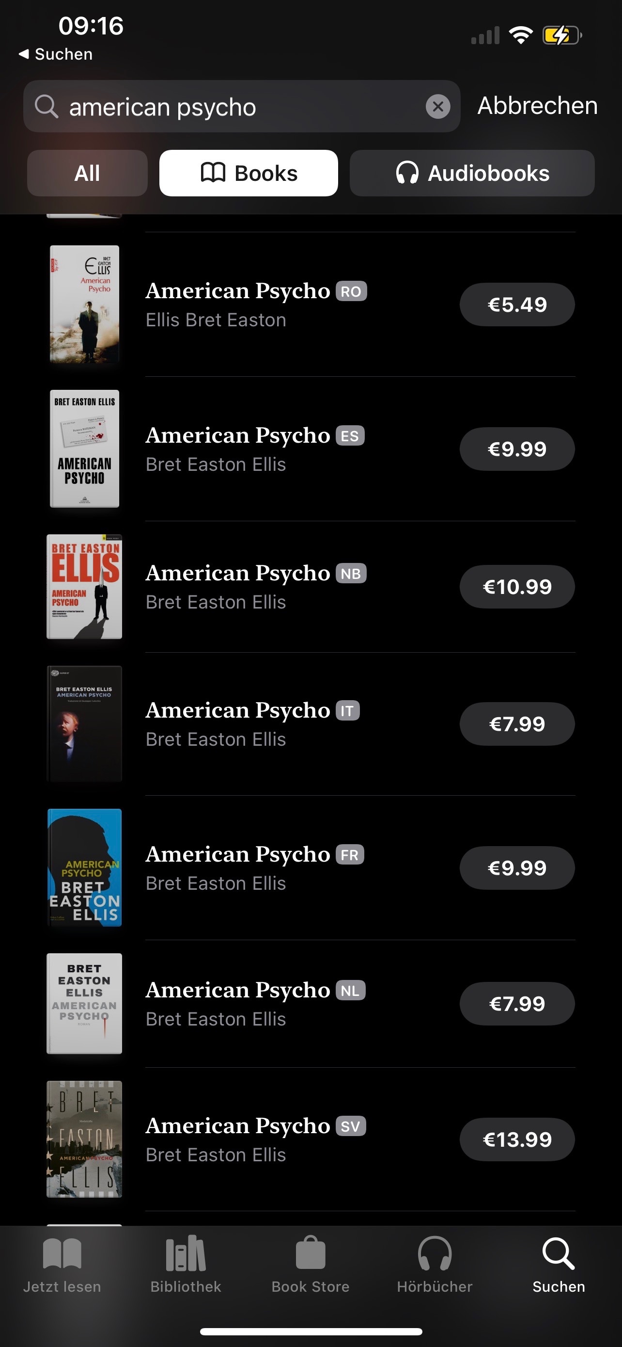 Du siehst also in der Übersicht von meiner Bildschirmaufnahme das Buch "American Psycho" in Spanisch, Italienisch, Niederländisch und Französisch und so weiter. Wenn du nach einem Buch suchst und eine Version antippst, dann wird dir zudem auch eine Vorschau angezeigt, wo du die Sprache dann sehen kannst.