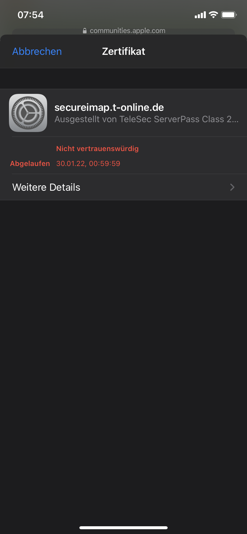 Das Problem haben wohl alle Telekomkunden. Siehe https://telekomhilft.telekom.de/t5/E-Mail-Programme/Outlook-secureimap-Zertifikat-abgelaufen/td-p/5548218.