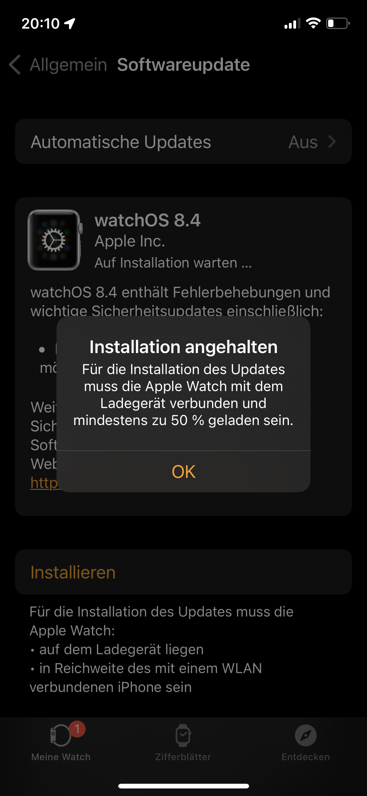 Das habe ich so probiert wen ich die Watch app öffne und auf Softwareupdate gehe kommt immer Installation angehalten und das die Watch min. 50% geladen sein muss und am Ladegerät der Akku ist voll und am Ladegerät.