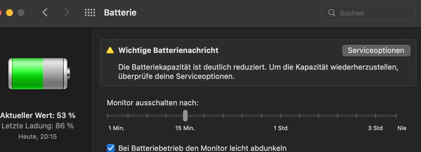 Ich habe mein MacBook nach einer 2 Wöchigen Display-Reparatur wegen Staingate wieder bekommen und jetzt steht bei der Batterie: Wichtige Batterienachricht, die Batteriekapazität ist deutlich reduziert, um die Kapazität wiederherzustellen überprüfe deine Serviceoptionen.