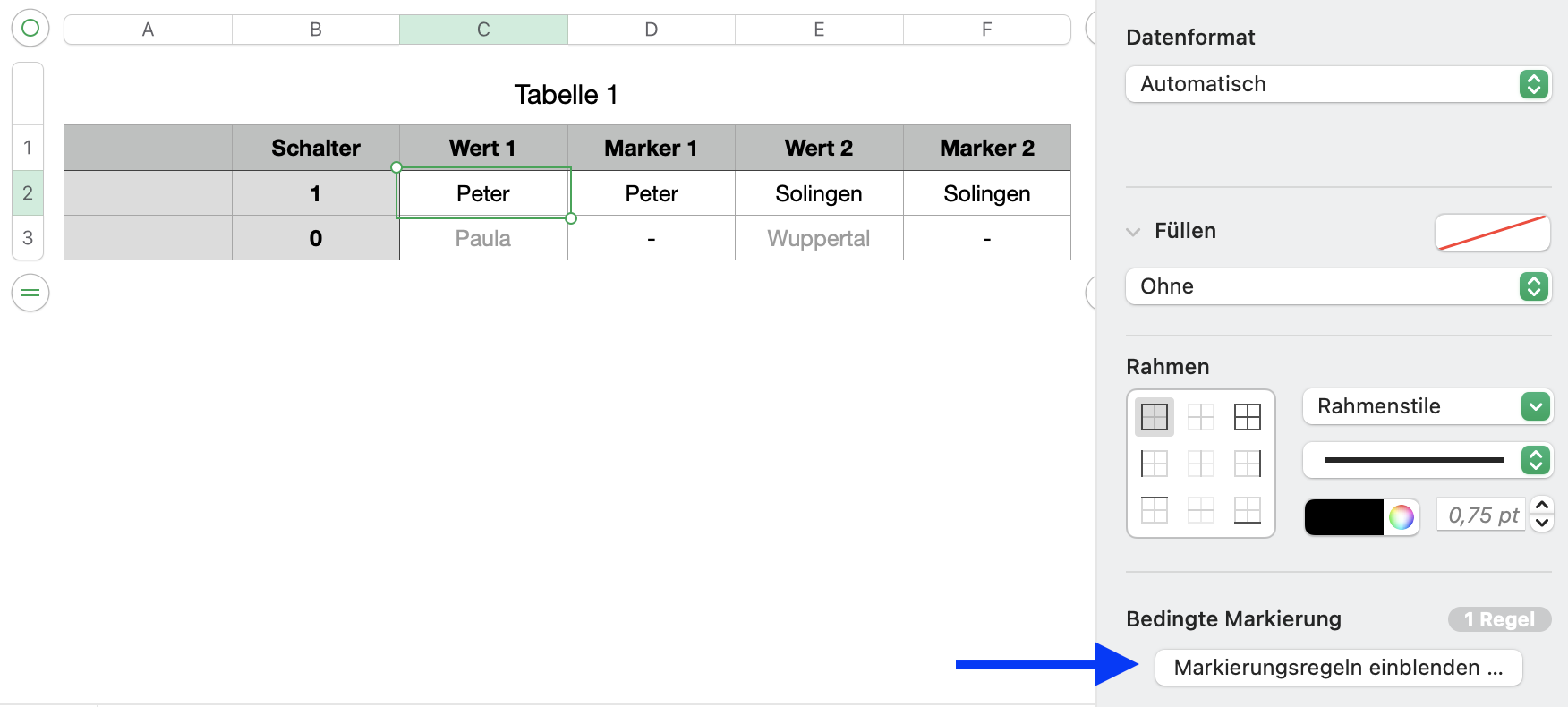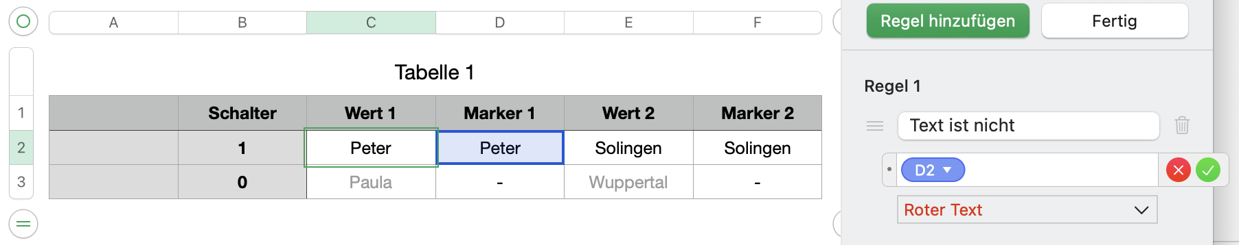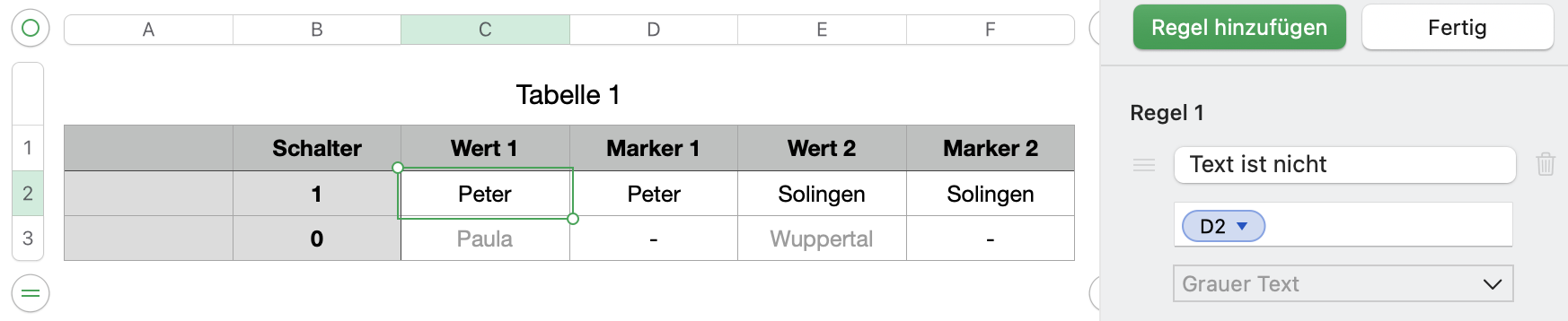 ich habe eine Tabelle erstellt und möchte Bedingte Markierung anwenden um die UX für meine Kollegen zu verbessern. Mit Google Tabelle hat es mit "Benutzerdefinierte Formel ist" funktioniert nur möchte ich auf Apple Numbers umsteigen.