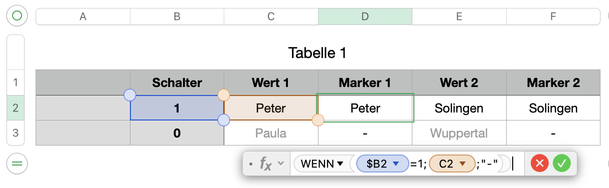 Wenn B2 auf 1 steht wird der Text aus C2 in D2 geschrieben, sonnst kommt ein - rein. Du kannst aber auch jedes andere Zeichen reinschreiben, solange es nicht der Text aus C2 ist.