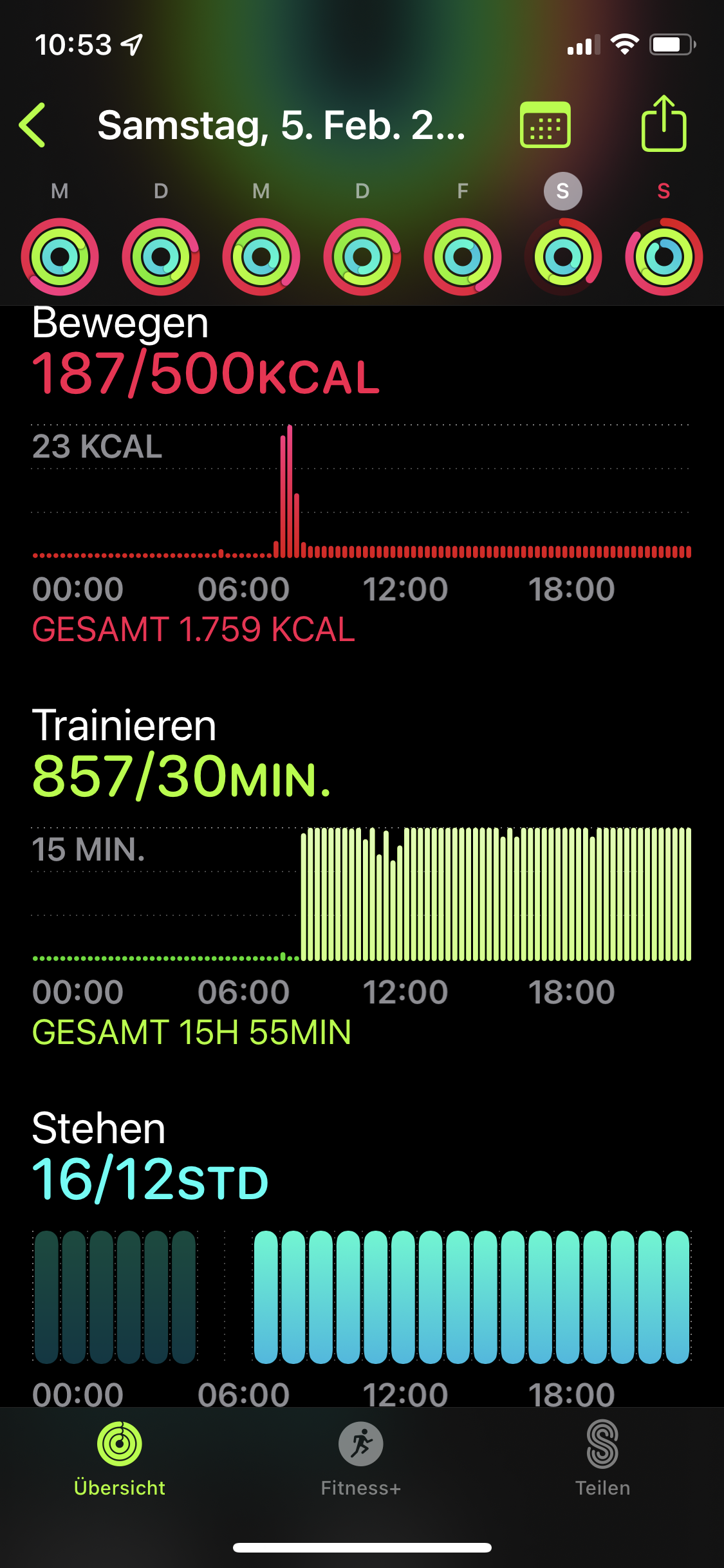 Heute morgen hat mir die app die Aktivitätskalorien von gestern so gut wie komplett gelöscht, dafür habe ich sowohl gestern, als auch heute über 600 Trainingsminuten und bereits 16 Stehstunden. Anbei das Foto von der Aufzeichnung des gestrigen Tages. Ursprünglich waren es um die 1000 Kalorien, 160 Minuten, 12 Stunden