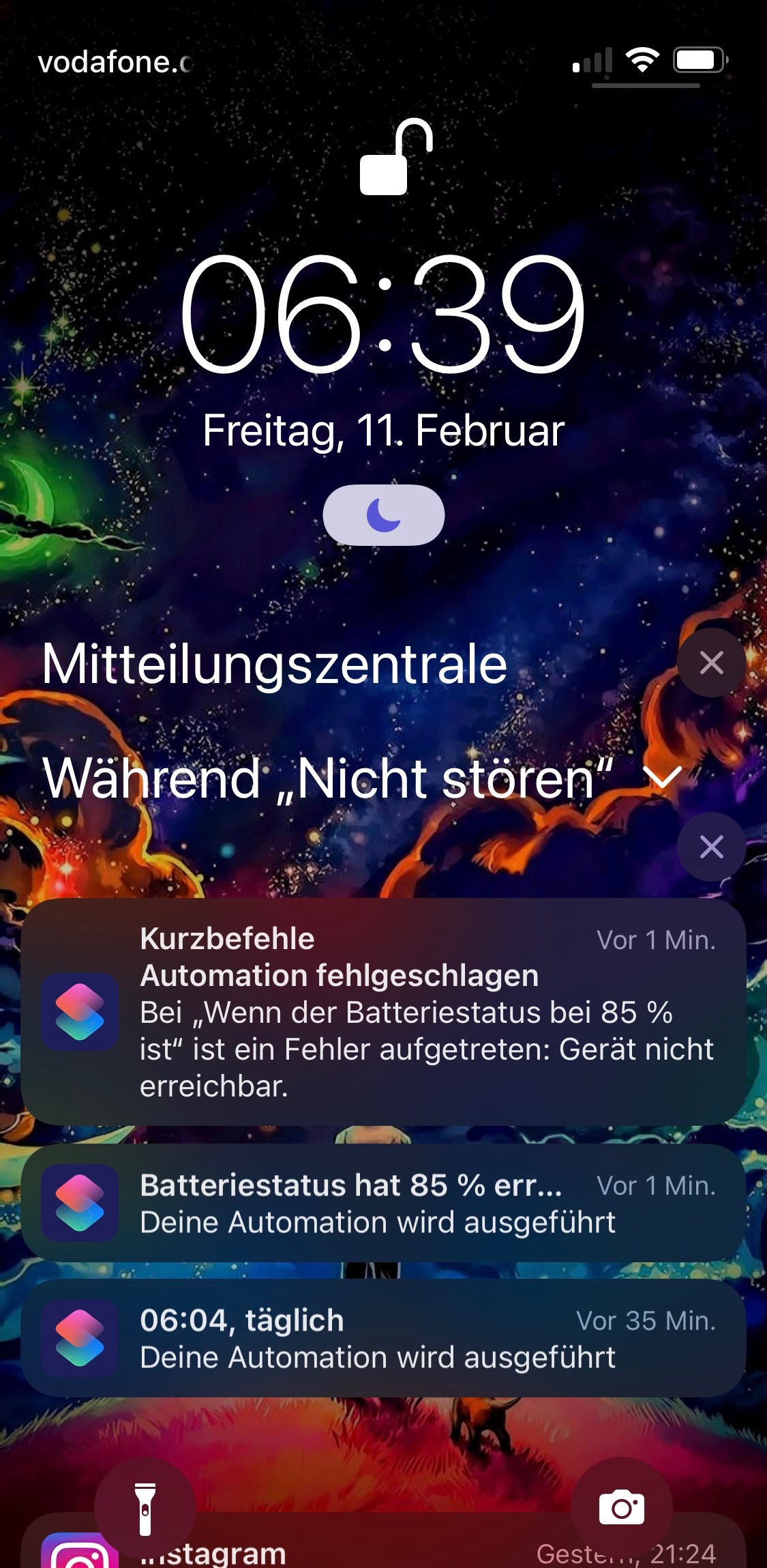 Hintergrund Dienste sind eingeschaltet. Bitte nicht stören ausgeschaltet. Kurzbefehle App steht auf „ohne Bestätigung auslösen“.