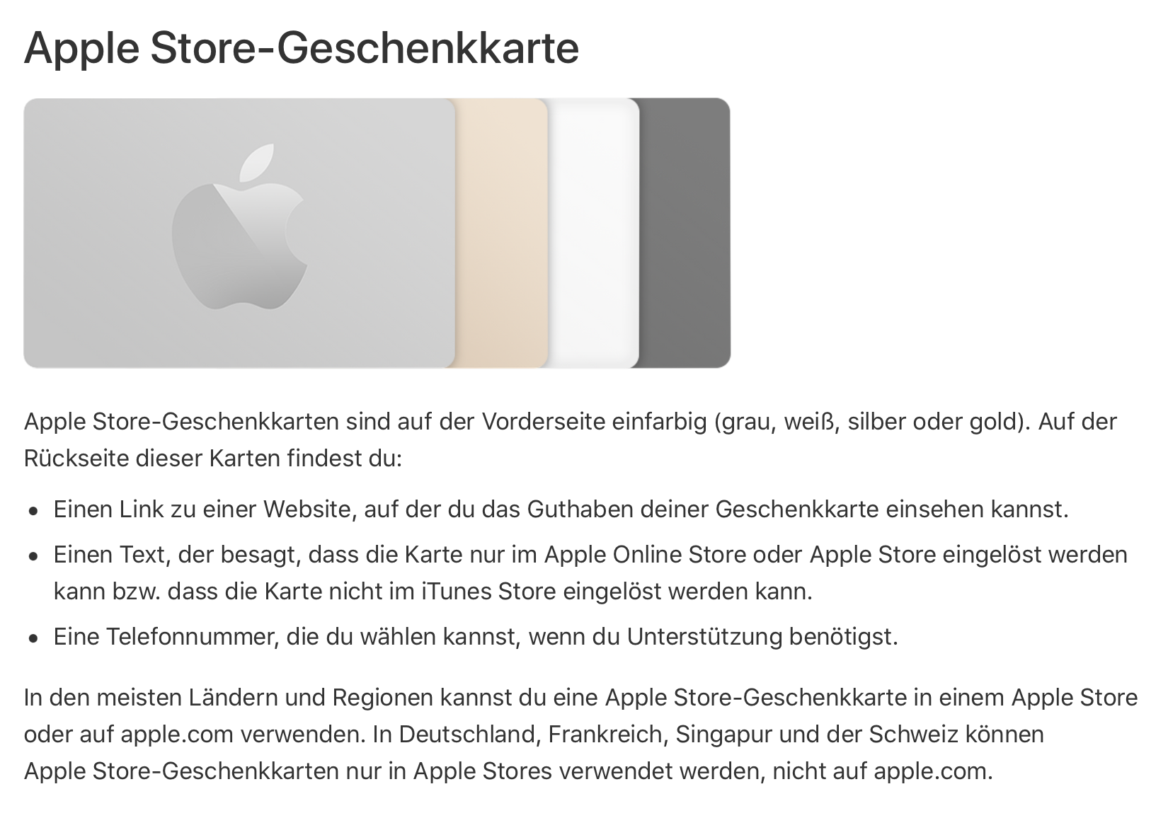 Weiss jemand wo ich eine Apple Store Geschenkkarte für die Schweiz kaufen kann? Nur im Apple Store selber? Ich meine eine wo man damit im Apple Store selber einkaufen kann. Also praktisch ein Wertgutschein.