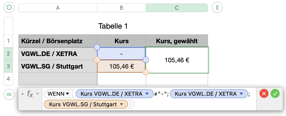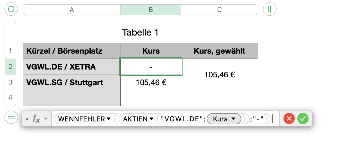 Mittels der Funktion "Aktienkurs" suche ich mir die Aktien + Börsenplatz raus, Bsp. APC.DE (Apple Aktienkurs von Xetra). So weit, so gut.