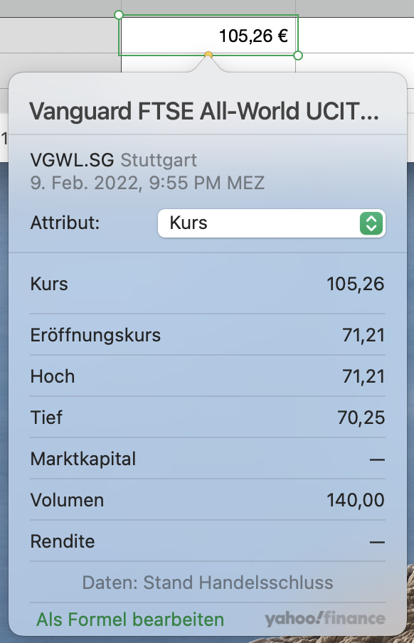 Erneut wähle ich mit der Funktion "Aktienkurs" ein ETF aus, Bsp. "VGWL.DE" (Vanguard FTSE All-WORLD UCITS".