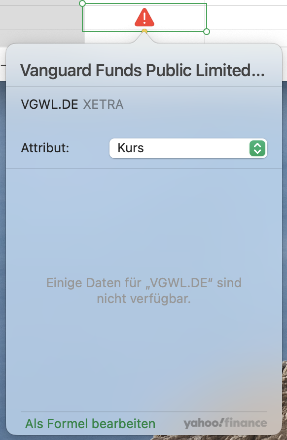 Jetzt zum Problem: Wenn ich diesen ETF auswähle, wird einfach ein Rotes Warndreieck angezeigt mit der Info "Für das Attribut "Kurs" gibt es keine Daten für das ausgewählte Symbol". Suche ich aber mal auf Yahoo Finance nach dem Symbol, gibt es sehr wohl aktuelle Daten. Wieso werden diese nicht in Numbers angezeigt ?