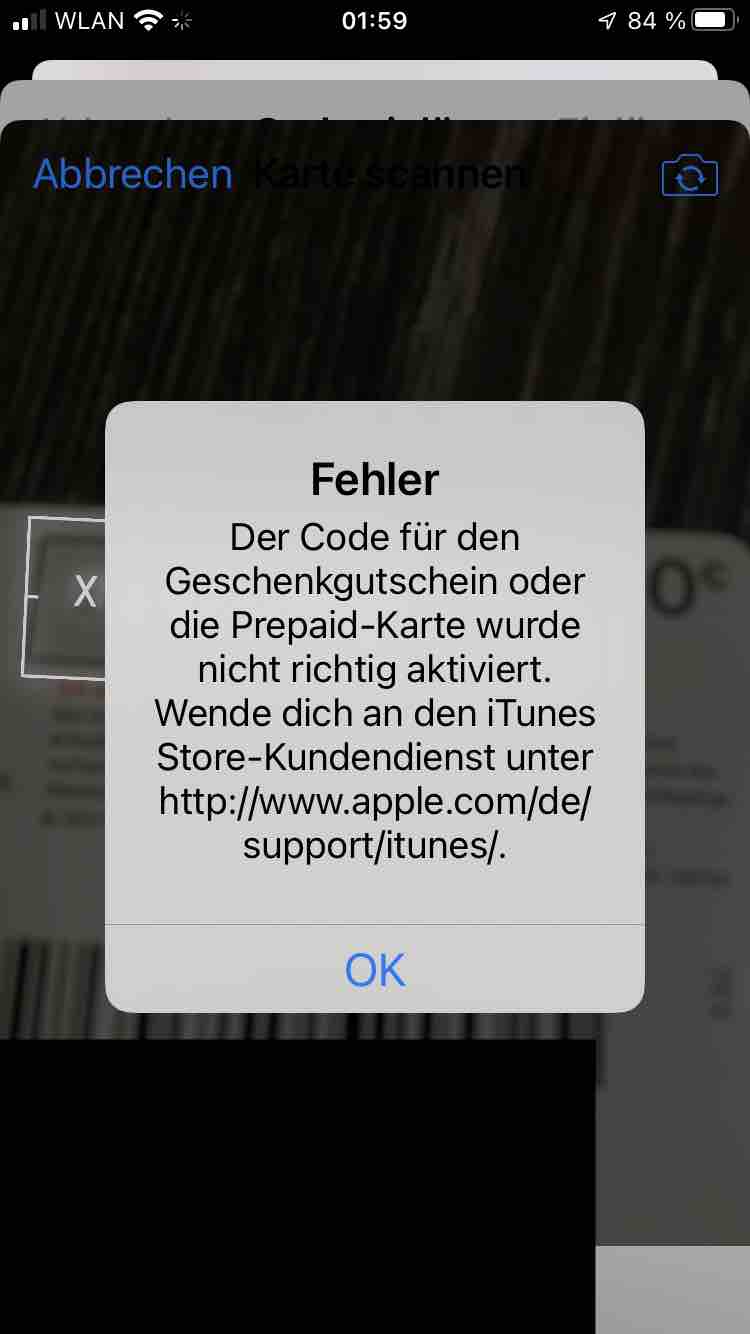 Ich kann meine iTunes Karte nicht aktivieren „der Code für die prepaid Karte wurde nicht richtig aktiviert“ sagt man mir