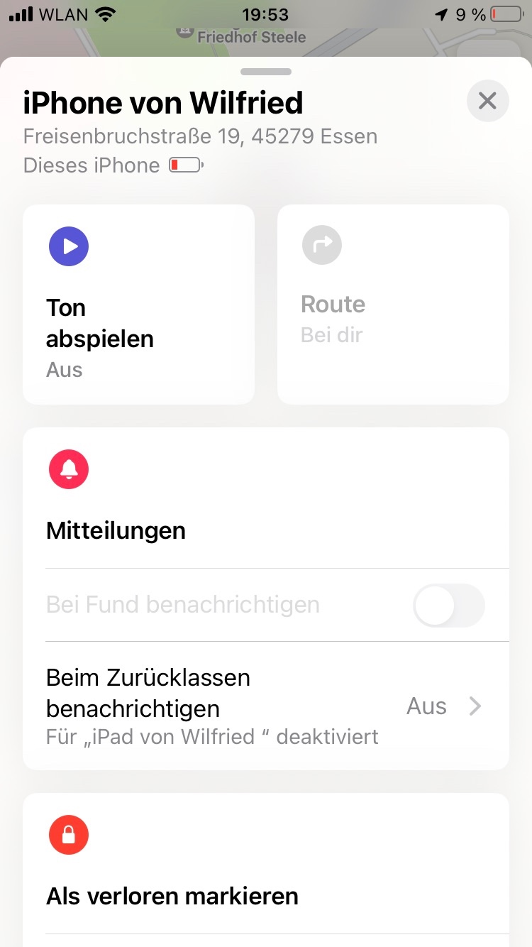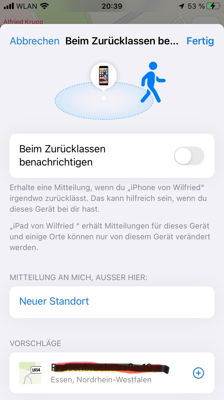 Kannst du bitte noch ein Foto von dem Menu schicken, das aufgeht, wenn du auf „Beim Zurücklassen benachrichtigen“ klickst? Außerdem noch eine Frage: Welches deiner Geräte aktualisiert denn deinen Standort?