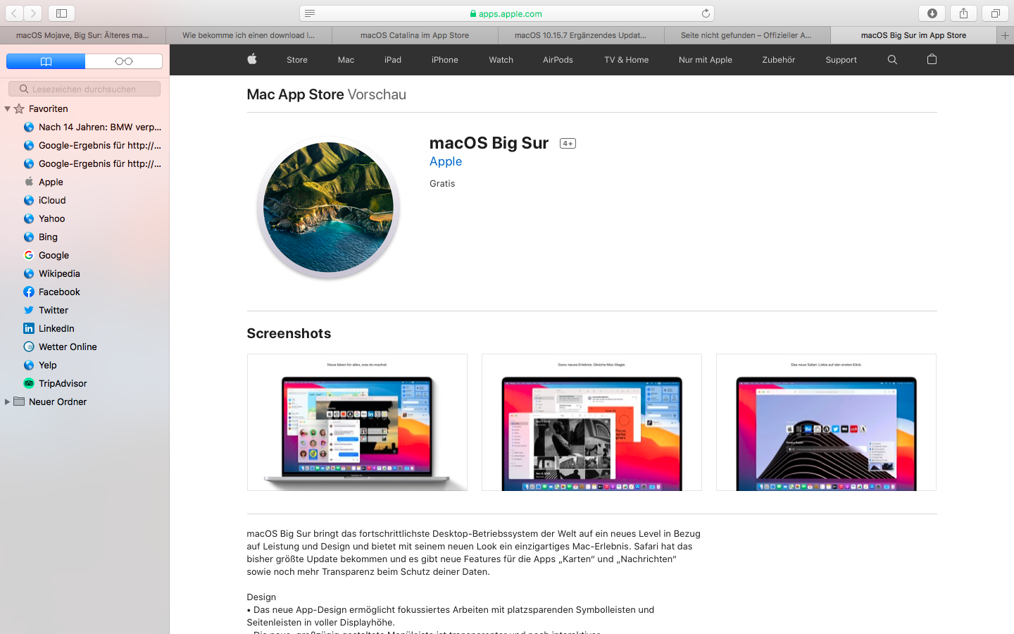 Hallo. Kann mir jemand sagen, wie ich einen download link für MacOs Big Sur bekomme? Aktuell nutze ich MacOs Sierra. Über den App-Store komme ich nur noch an MacOs Monterey. Mein MacBook Air ist dafür allerdings zu alt. Auf der offiziellen Apple-Seite komme ich nicht weiter.