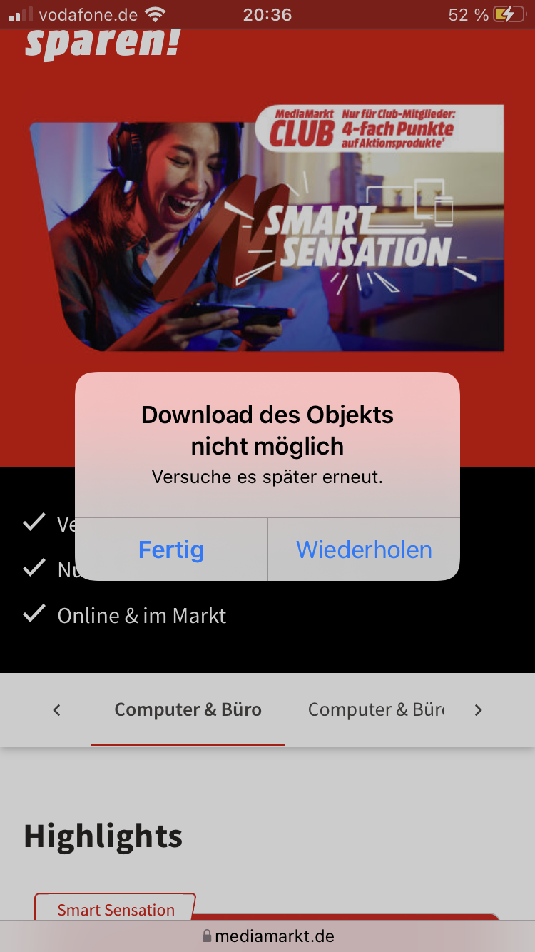 Seit einiger kommt die Fehlermeldung „Download des Objekts nicht möglich. Versuche es später erneut. Fertig. Wiederholen.“