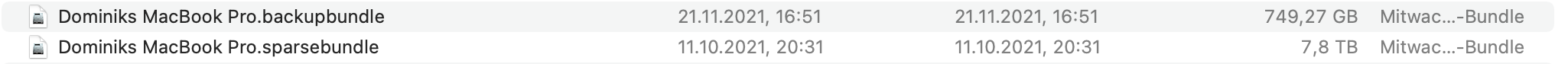Habe heute Nacht, nach fast 4 Monaten, zum ersten mal wieder ein fehlerfreies Backup anlegen können! das Problem wie ich es sehe erklärt sich dadurch, dass beim Wechsel von 10.12. auf 10.13 aus dem backupbundle ein sparsebundle wurde. Dieses besagte sparsebundle scheint aber mein NAS nicht von der Sicherung auszuschliessen (siehe Dateigrössen im angehängten Bild). Das 7,8TB backup (theoretischer wert) ist dann aber natürlich grösser als der physikalisch noch verfügbare Speicher auf meiner WDMyCloud, welche insgesamt 12TB im Raid 5 Verbund ausweist. Ich war echt am verzweifeln, bis ich gestern auf den Thread hier gestossen bin und mir daraufhin die Backupdateien mal genauer angeschaut hatte. Nur warum dann macOS so eine komisch zu deutende Fehlermeldung statt einem verweis auf Dateigrössen ausgibt weiß nur Apple. Wird stellenweise leider immer mehr wie das OS aus Redmond...
