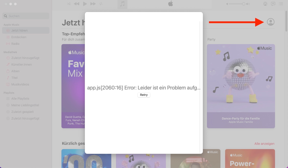 - Sobald ich jetzt rechts oben unter der Leiste das Avatar Symbol (roter Pfeil) zum einloggen anklicke, bekommt man die nachfolgende Fehlermeldung und die Musik App reagiert nicht mehr