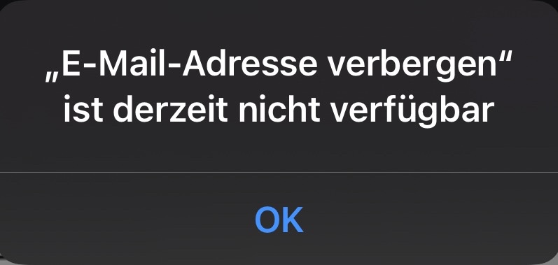 Auf dem iPhone wird mir angezeigt, dass die Funktion "E-Mail-Adresse verbergen derzeit nicht verfügbar ist". Screenshot 1. Auf meinem Mac Mini kommt hingegen nur die Meldung "Ein Fehler ist aufgetreten". Screenshot 2.