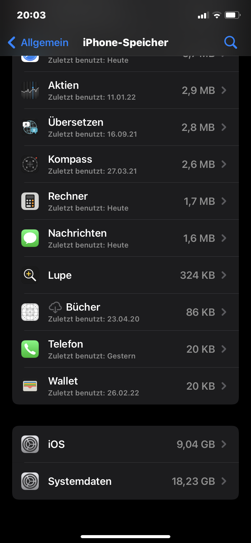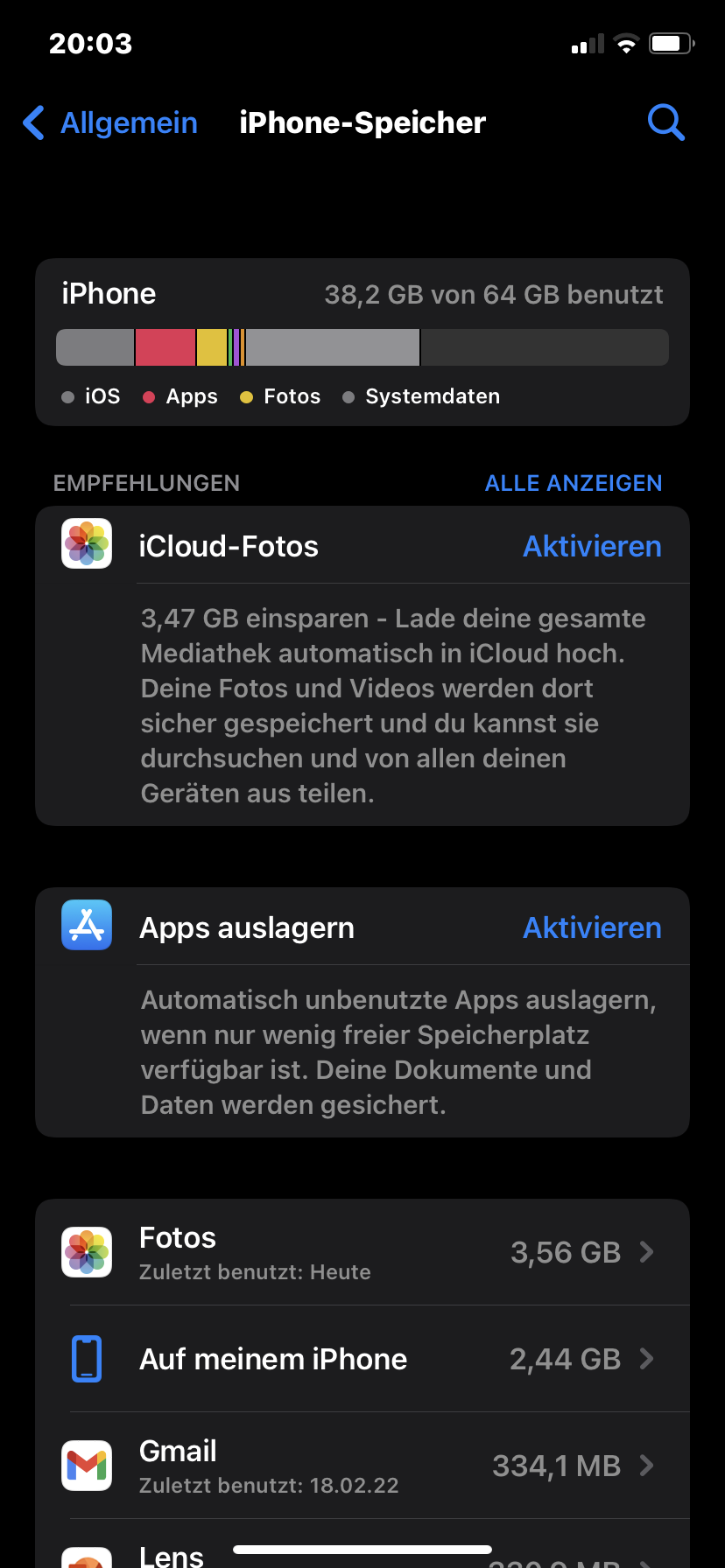 Was auch noch Hilfreich ist, sich einfach mal die Mediathek der Fotos auf dem iPhone anzusehen. Viele Fotos entstehen, weil man schnell ein Bildschirmfoto erstellt hat, um einem Freund etwas zu zeigen, und man diese Fotos dann nicht mehr braucht. Aber diese bleiben trotzdem immer noch in der Mediathek enthalten und fressen Speicherplatz.