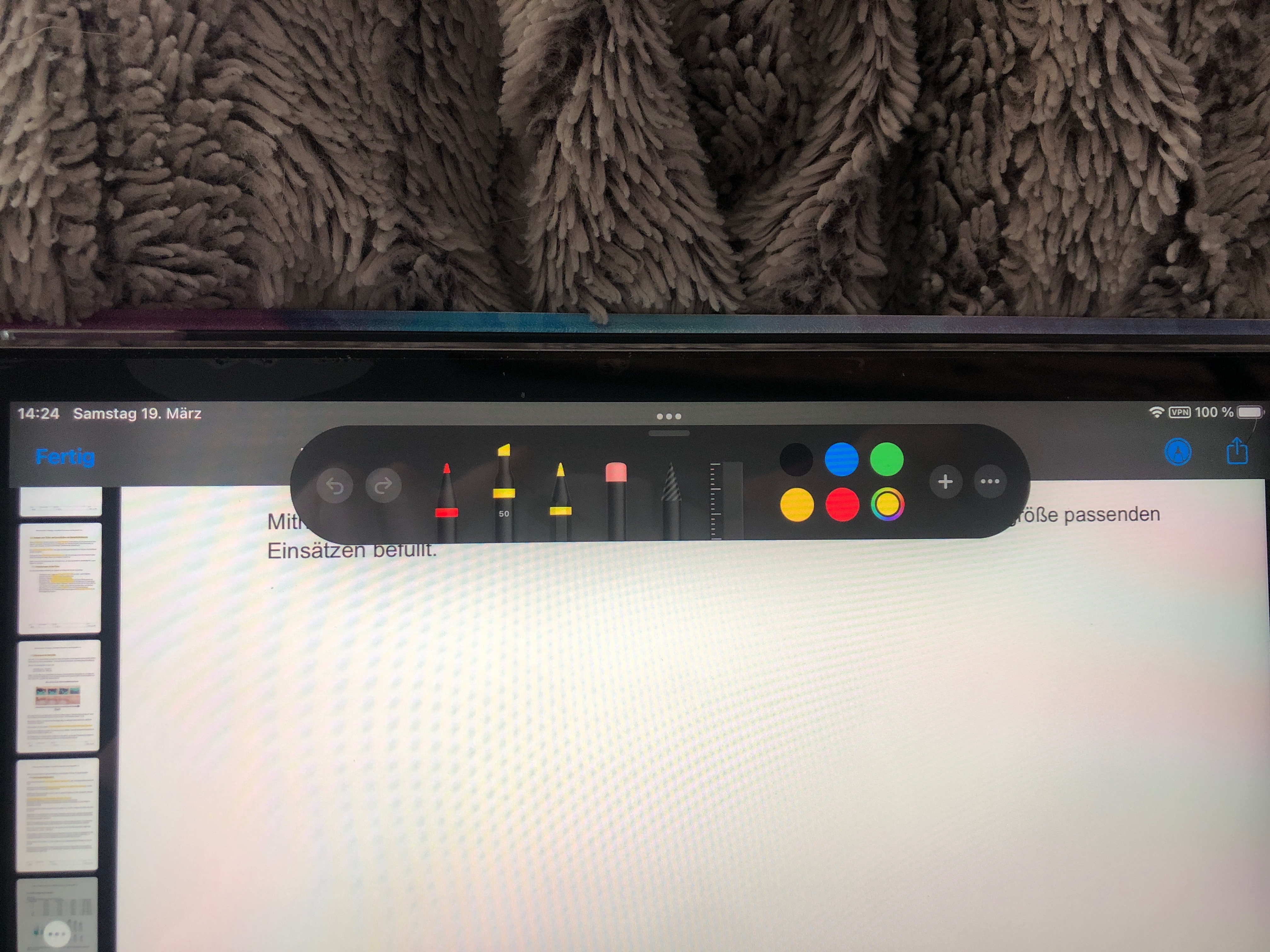 Hallo, ich bin grade am lernen für die Prüfungen und nutze dabei die Funktionen meiner Dateien am iPad wie markieren und Texte dazu schreiben. Leider ist es mir jetzt schon mehrmals passiert, dass die Anwendung kurz hängt und dann die Markierungen seit dem vermeintlich letzten Speicherschritt löscht. Bei 350 Seiten ist das super ärgerlich! Ich hätte fast das Tablet gegen die Wand geworfen… im Internet stand ich soll es Updaten, gesagt getan, keine Veränderung. Selbst wenn ich die Datei öfter verlasse oder die Bearbeitung beende speichert es nicht und bis zu 80 Seiten Markierungen und Anmerkungen hat es mir mehrmals gelöscht. Gibt es hier Abhilfe oder eine einfache Lösung? Ich wäre sehr dankbar dafür! Danke!