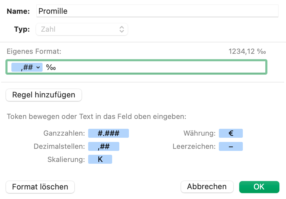 ich wollte in Numbers eine Zelle für Promillewerte formatieren. Diesbezüglich konnte ich bisher keinen Beitrag finden. Auch die Handbücher konnten mir nicht direkt helfen. Daher habe ich folgenden Weg gewählt: