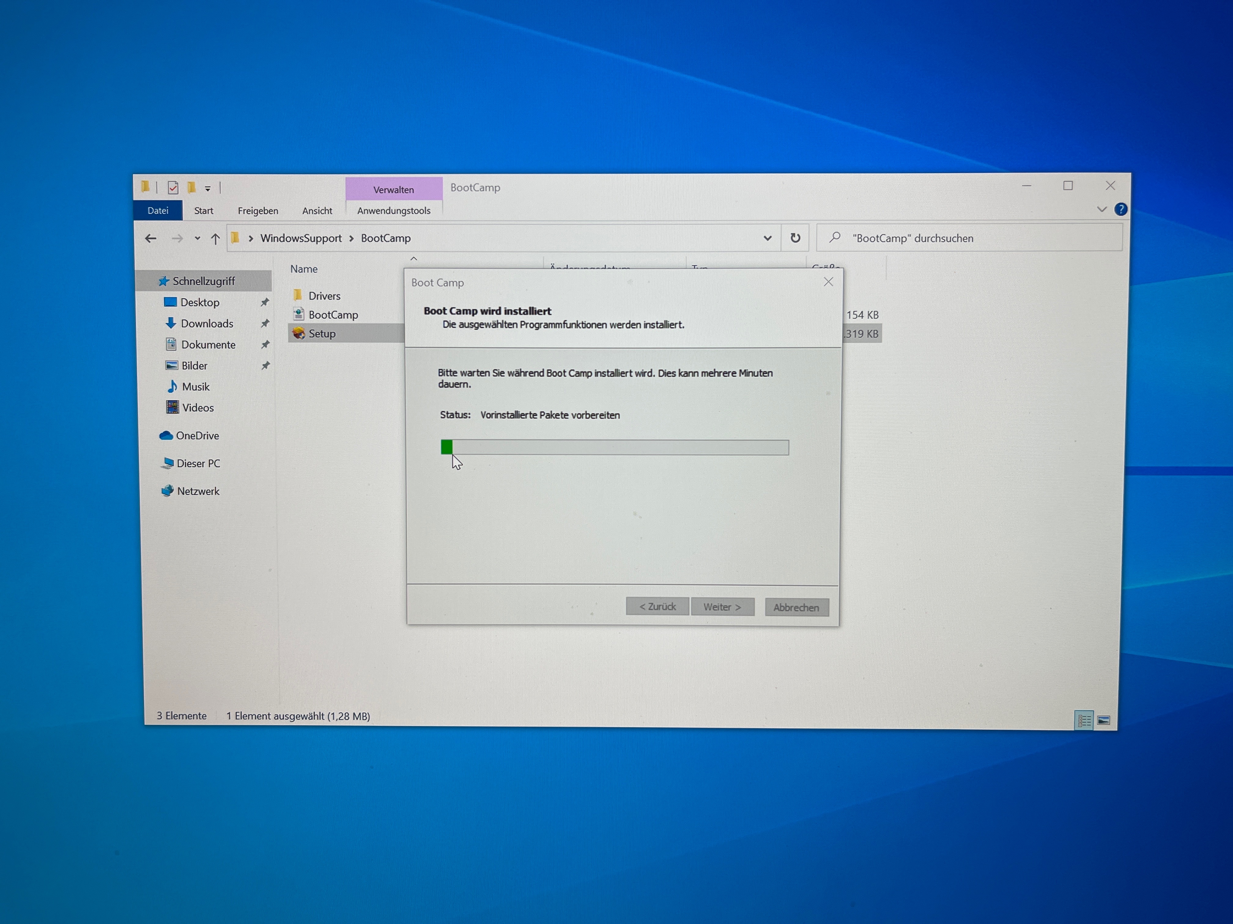 Nun muss ich, um die volle Funktionalität zu erhalten, wie üblich die Windows Support Software installieren. Doch leider bleibt der Installer ständig bei „Vorinstallierte Pakete vorbereiten“ hängen.