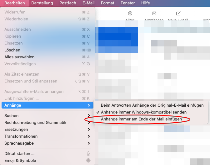 Nun schreibe ich meine Mails immer zuende, platziere dann meine Anhänge, die dann optisch unter meiner Grußformel direkt in der Mail zu sehen sind und danach dann die Signatur.
