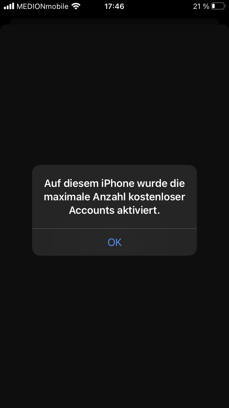 Meldung "Auf diesem iPhone wurde die Maximale Anzahl Kostenloser Accounts aktiviert"